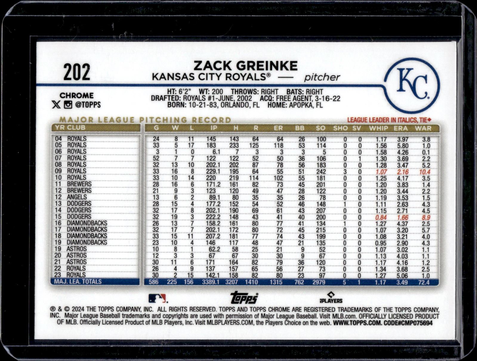 Zack Greinke Blue Raywave Refractor /150 2024 Topps Chrome #202