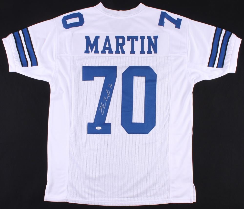 Custom on-field style jersey. Everything is sewn on, size XL. Hand-signed in silver paint pen by Zack Martin.