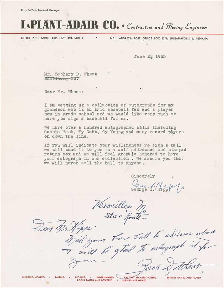 ALS signed “Zack D. Wheat,” one page, 8.5 x 11, no date. Short letter of response written at the bottom of a TLS to Wheat, dated June 2, 1955, inquiring if Wheat would sign a baseball if sent, which will in turn be sent to Cy Young, Ty Cobb, and Connie Mack. Wheat writes, “Mail your baseball to the address above & I will be glad to autograph it for you.” Neatly signed underneath by Wheat. In fine condition, with several intersecting mailing folds, one through a single letter of signature. Pre-certified Steve Grad/PSA/DNA and RRAuction COA.