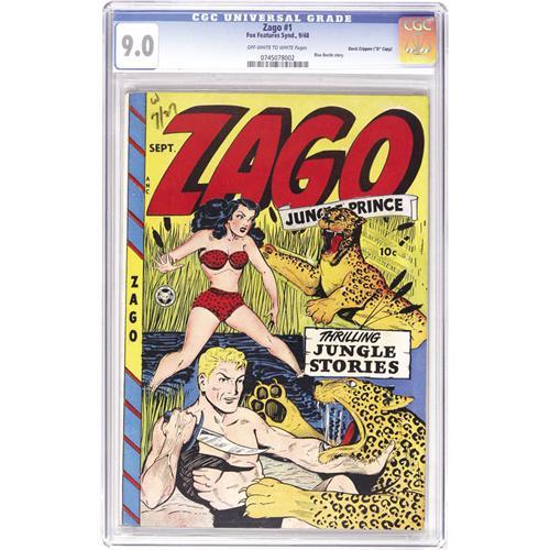 <B>Zago #1 Davis Crippen ("D" Copy) pedigree (Fox Features Syndicate, 1948) CGC VF/NM 9.0 Off-white to white pages.</B></I> Don't confuse <B>Zago</B></I> with <B>Zegra</B></I> or <B>Zoot</B></I>! Actually, we'll forgive you if you do, they're all Fox "jungle girl" titles! Ah, but how often do you see a Fox jungle title in such nice condition? By the way, the Blue Beetle appears in a backup feature. Overstreet 2006 VF/NM 9.0 value = $603; NM- 9.2 value = $825. CGC census 6/06: 1 in 9.0, 1 higher. <I>From the Crippen Collection.</B></I> <BR><BR><B>Important notice:</B> Heritage usually auctions material at the rate of 200-250 lots per hour. On some occasions eBay Live bid software or the Internet may not be able to keep up with the pace of the auction. We recommend placing a realistic absentee bid now as insurance to avoid disappointment. Occasionally the auctioneer may eliminate or reject an eBay Live bid, and the auctioneer may also reopen a lot after the close of the eBay live bidding (usually because we missed an audience bid), and may reject your bid even if it shows you as the winning bidder. By bidding via eBay Live, you agree that Heritage may award the lot to another bidder at its sole discretion under the circumstances described above or any other reasonable circumstances. Since eBay bids are not shown to us until we open the lot on the floor, we treat those bids just like floor bids. In most cases the floor responds before the eBay bid is presented to us, due to Internet lag time, so for consistency we have made it a policy that floor bids are always considered first over tie eBay live bids. Also please note that all Heritage lots purchased through eBay Live carry a 22.5% Buyer's Premium. Please make sure you read the Terms and Conditions before you bid. This lot is being auctioned in conjunction with a live floor auction by Heritage Auction Galleries. All final auction and invoice information will be supplied by Heritage Auction Galleries, and all other information should be considered preliminary. Lot:41001 <BR><BR><B>Winning Notification and Billing:</B> After the FINAL session in this auction is complete, Heritage will send e-mail and snail mail invoices. This process normally takes several days. All final auction and invoice information will be supplied by Heritage Auction Galleries, and all other information should be considered preliminary. <BR><BR>This auction will be conducted on a live auction floor and over the Internet through eBay Live. If you choose to place an absentee bid, please take a moment to <font color='#0000ff'><u><a href='http://pages.ebay.com/liveauctions/help/before/laabsentee.html'>learn how eBay Live absentee bidding works</a></u></font><font color='#000000'>