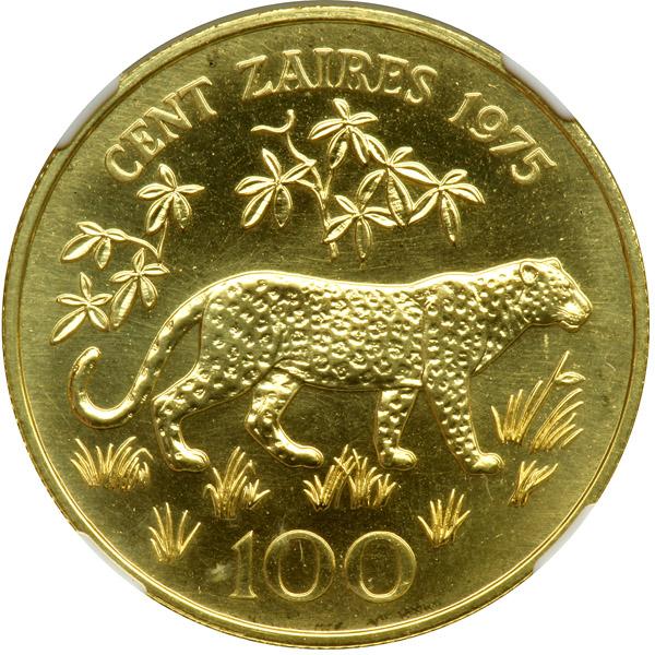 Zaire. 100 Zaires, 1975. Fr-1; KM-11. Weight 0.9675 ounce. Mintage 1,415. President Mobutu. Reverse: Leopard. NGC graded MS-68.