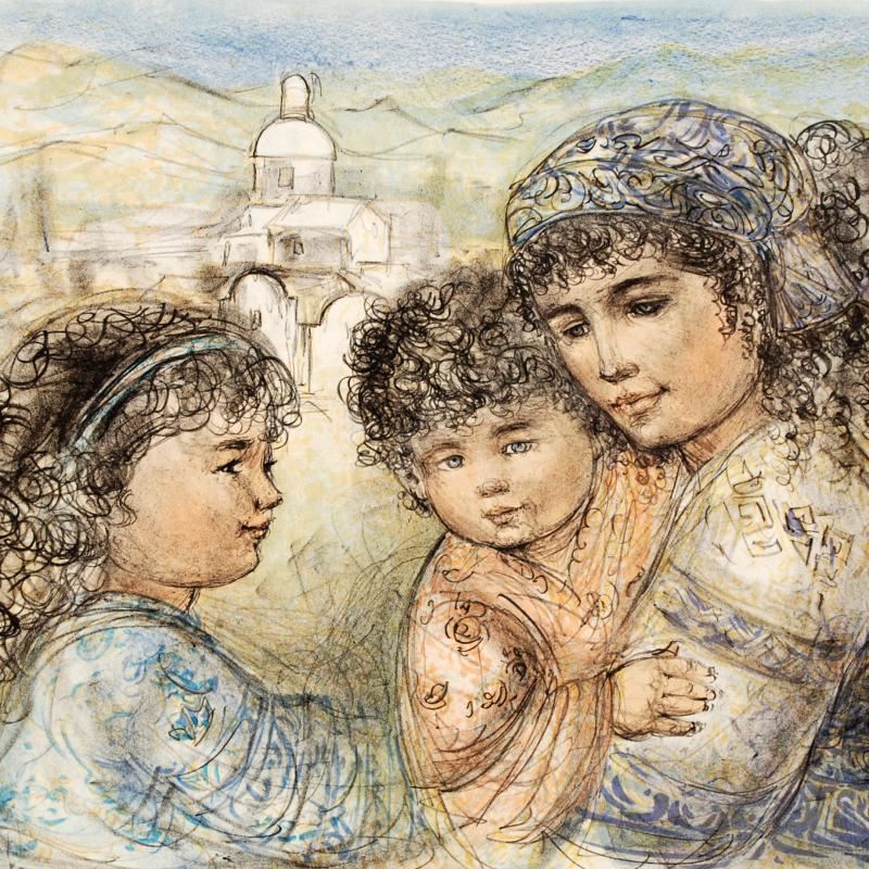 "Zalina with Aries and Ande" is a limited edition lithograph on rice paper, numbered and hand signed by Edna Hibel (1917-2014). Includes Certificate of Authenticity! Measures approx. 35.5" x 25" (with border), 30" x 20" (image).