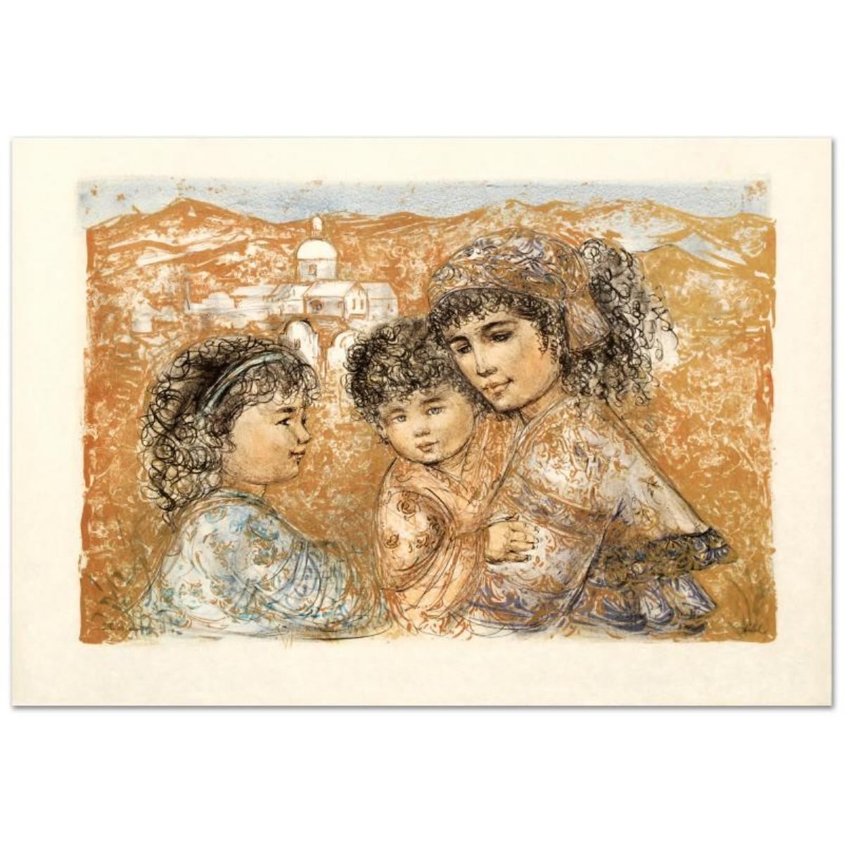 "Zalina with Aries and Ande" is a limited edition lithograph on rice paper, numbered and hand signed by Edna Hibel (1917-2014). Includes Certificate of Authenticity! Measures approx. 35.5" x 25" (with border), 30" x 20" (image).