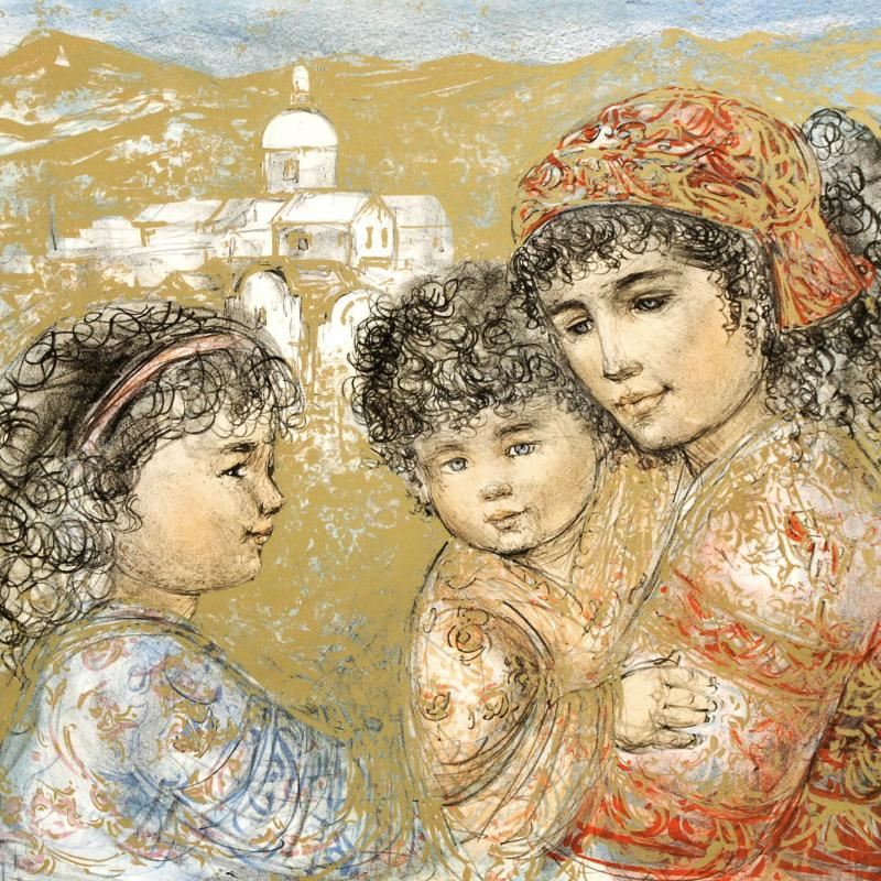 "Zalina with Aries and Ande" is a limited edition lithograph on paper, numbered and hand signed by Edna Hibel (1917-2014). Includes Certificate of Authenticity! Measures approx. 35.5" x 25" (with border), 30" x 20" (image).