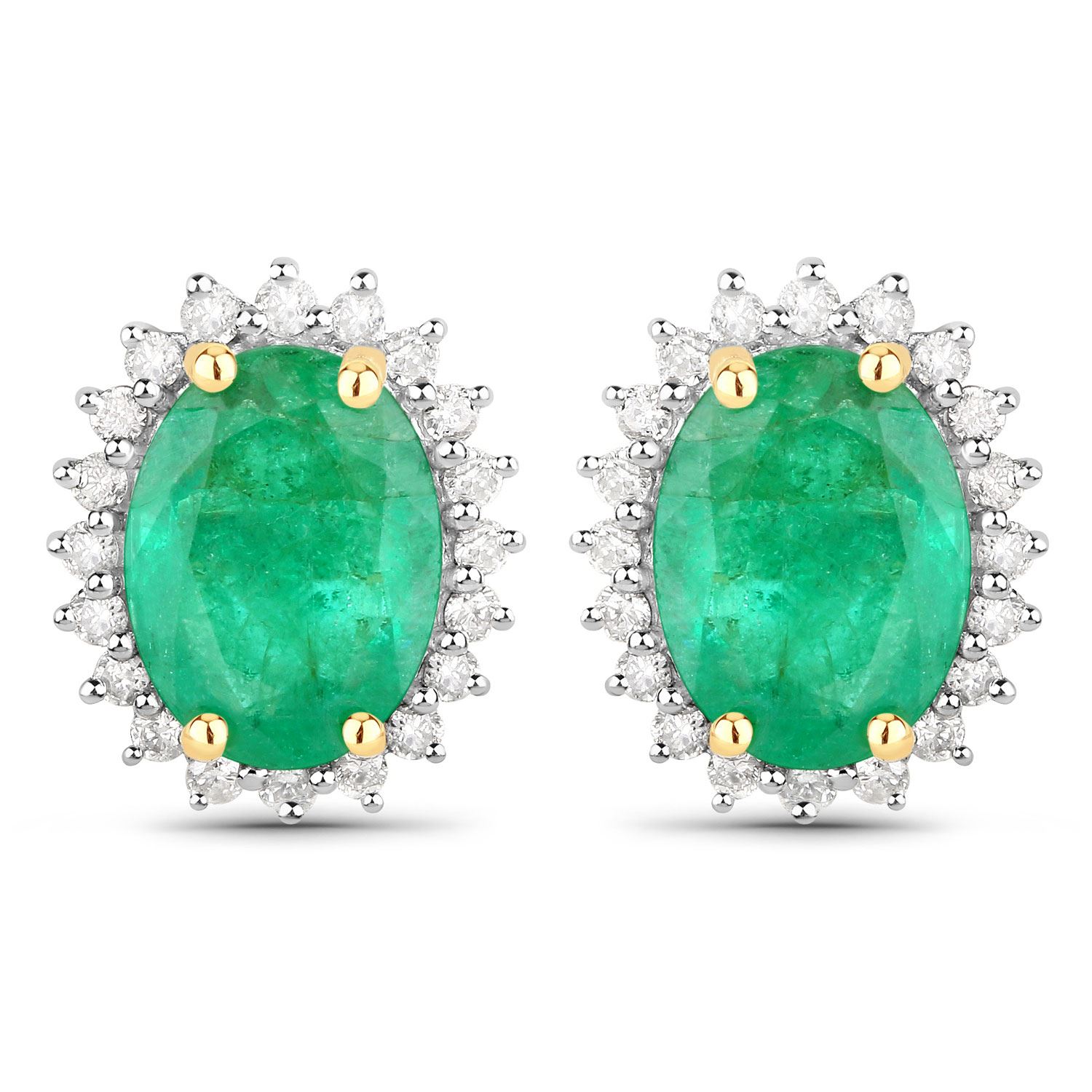 Everyone will know just how lucky you are when you wear these 14 karat yellow gold earrings featuring 2.40 carats total weight of genuine Zambian emeralds and .26 carats total weight of round, brilliant-cut, H-I color, I1 clarity diamonds in the sparkling halo. The earrings attach to the earlobe with posts and friction backs. Admin: Q5743/4-err