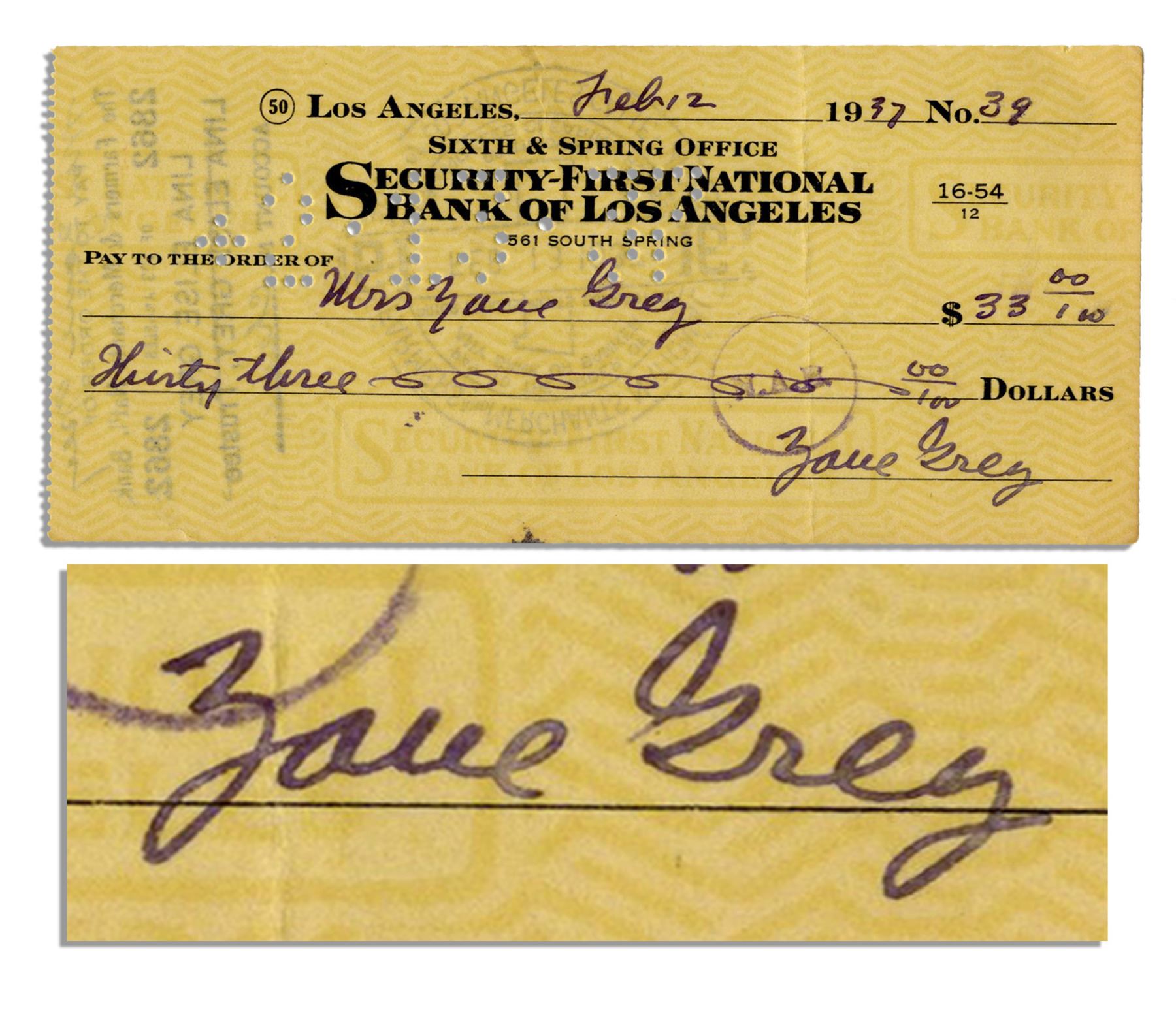 Zane Grey handwrites and signs a check, dated 12 February 1937. The dentist from Zanesville, Ohio, who wrote a series of popular Western novels, writes a check to ''Mrs Zane Grey'' for $33.10 on the Security First National Bank of Los Angeles. Grey's book, ''West of the Pecos'', was published the year of this check. Grey's wife also endorses the check, ''Mrs Zane Grey''. Lina Ellise Grey, her full name, is stamped on the verso. Near fine.