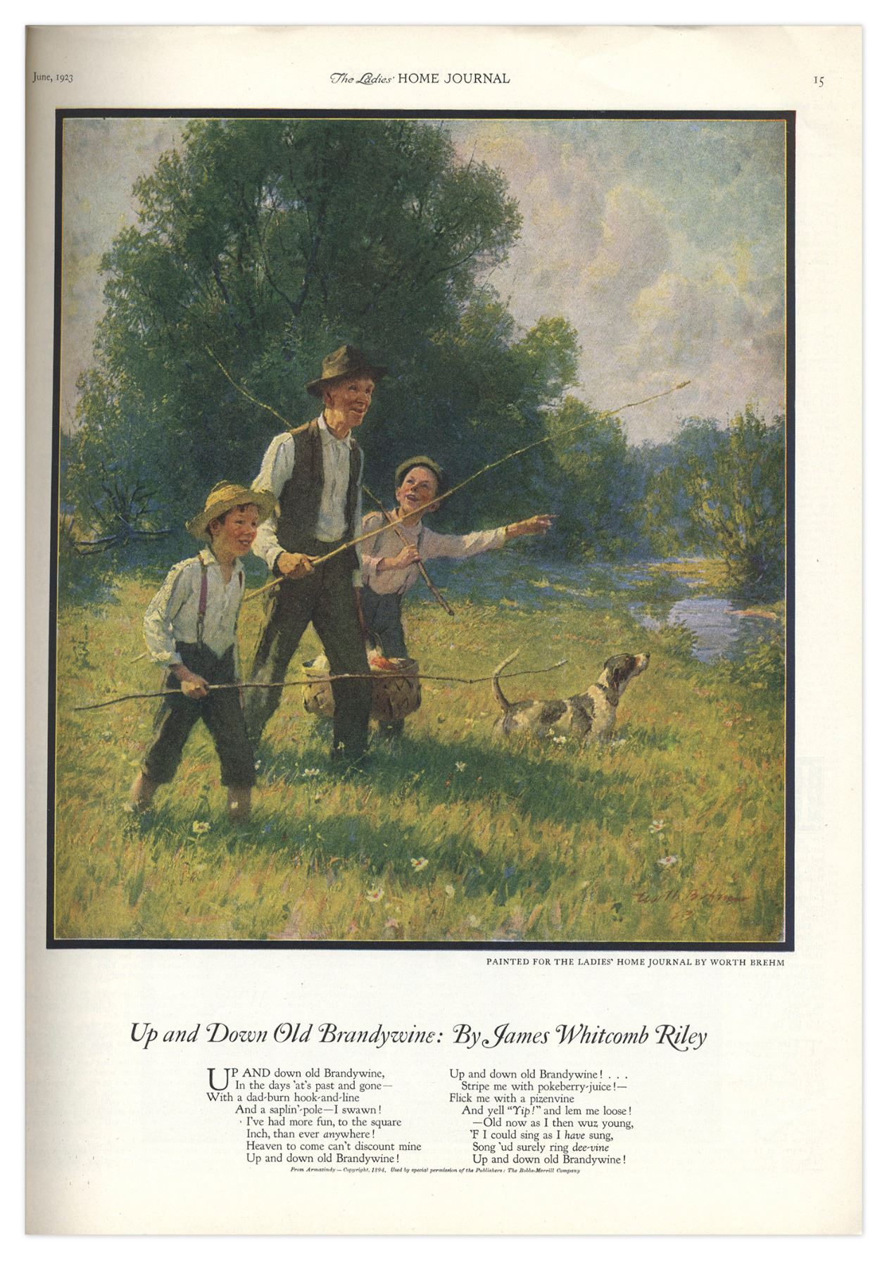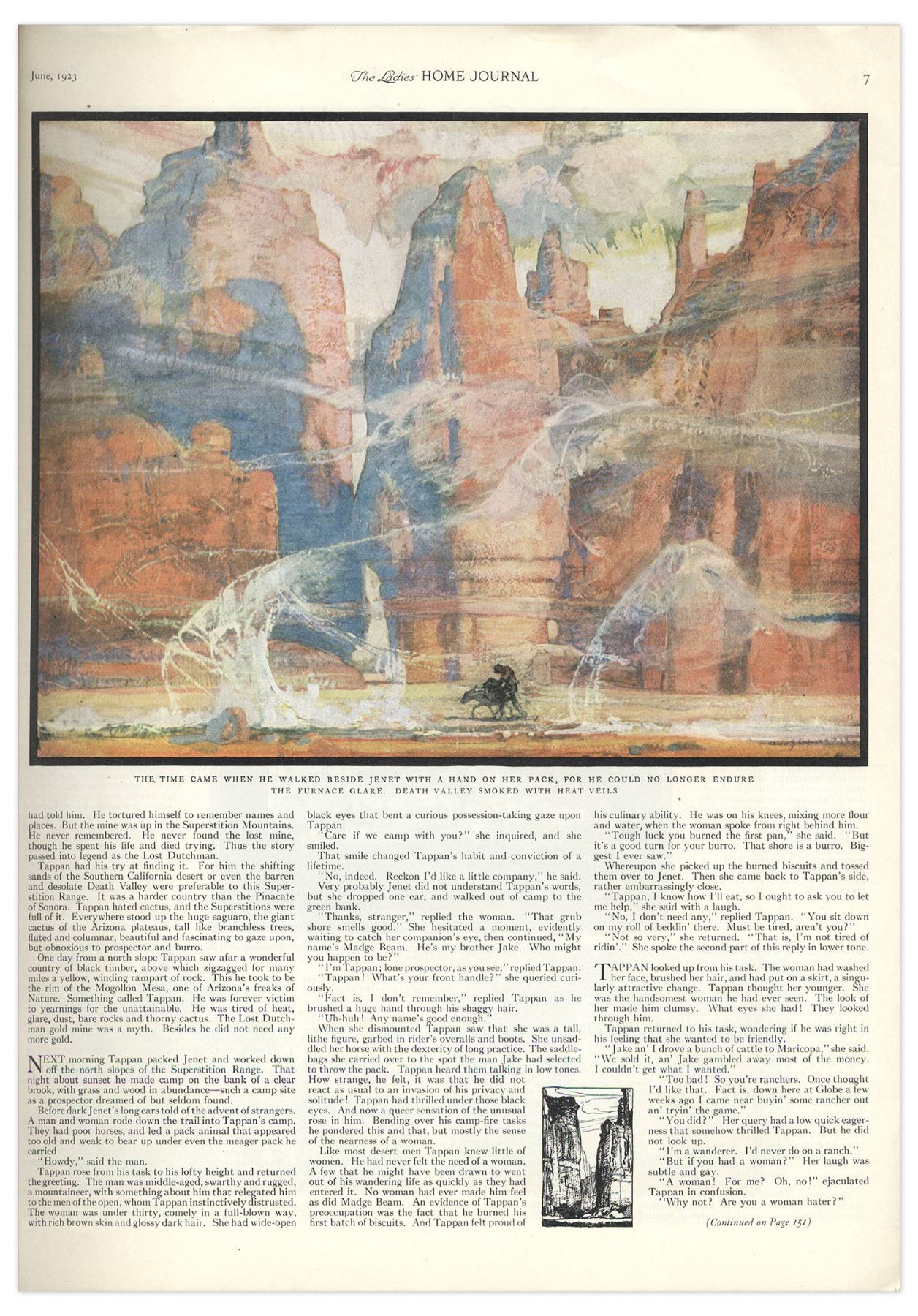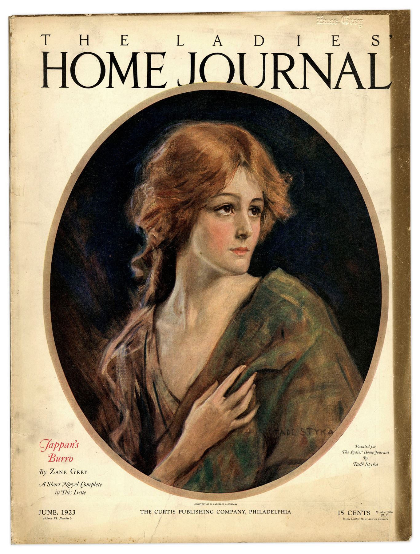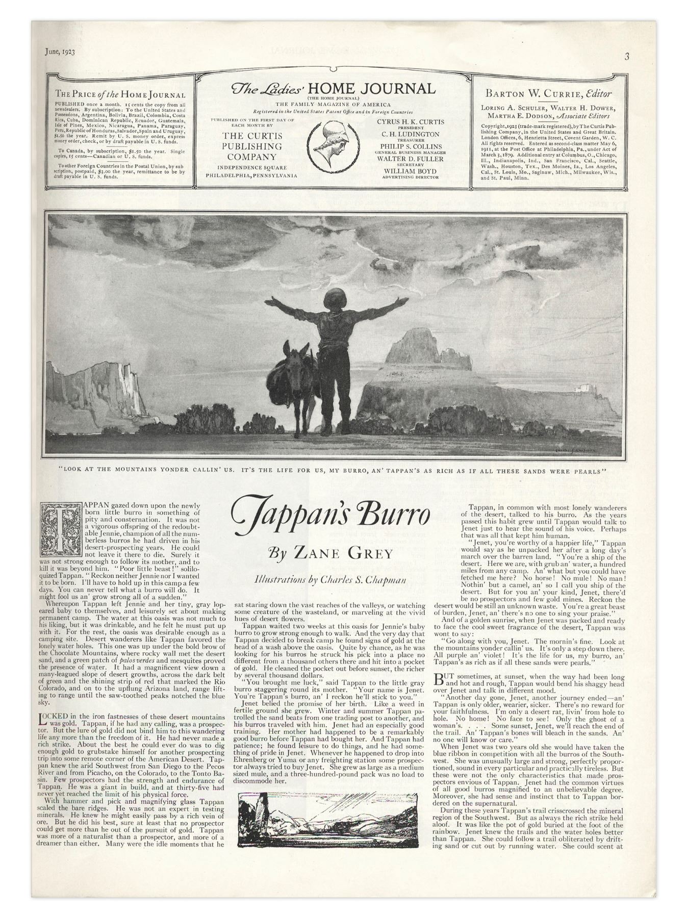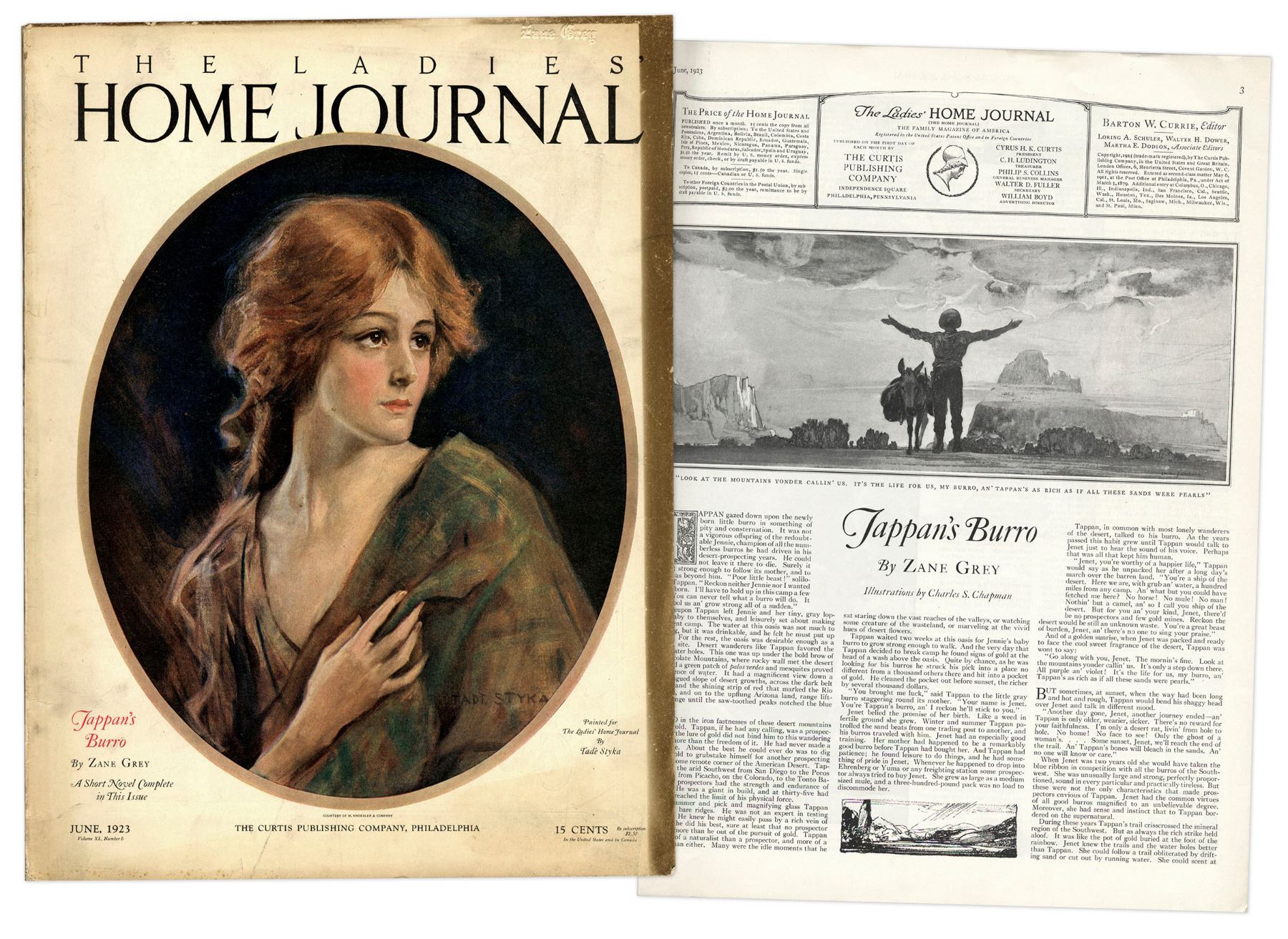 Complete June 1923 issue of the ''Ladies Home Journal'', owned by Zane Grey and with his blind stamp on the front cover. Issue includes the first appearance of Grey's ''Tappan's Burro'', with illustrations by Charles S. Chapman. Magazine also includes stories by F. Scott Fitzgerald and James Whitcomb Riley. Measures 10'' x 14'' and runs 208pp. Chips to front cover and a loose back cover; very good condition.