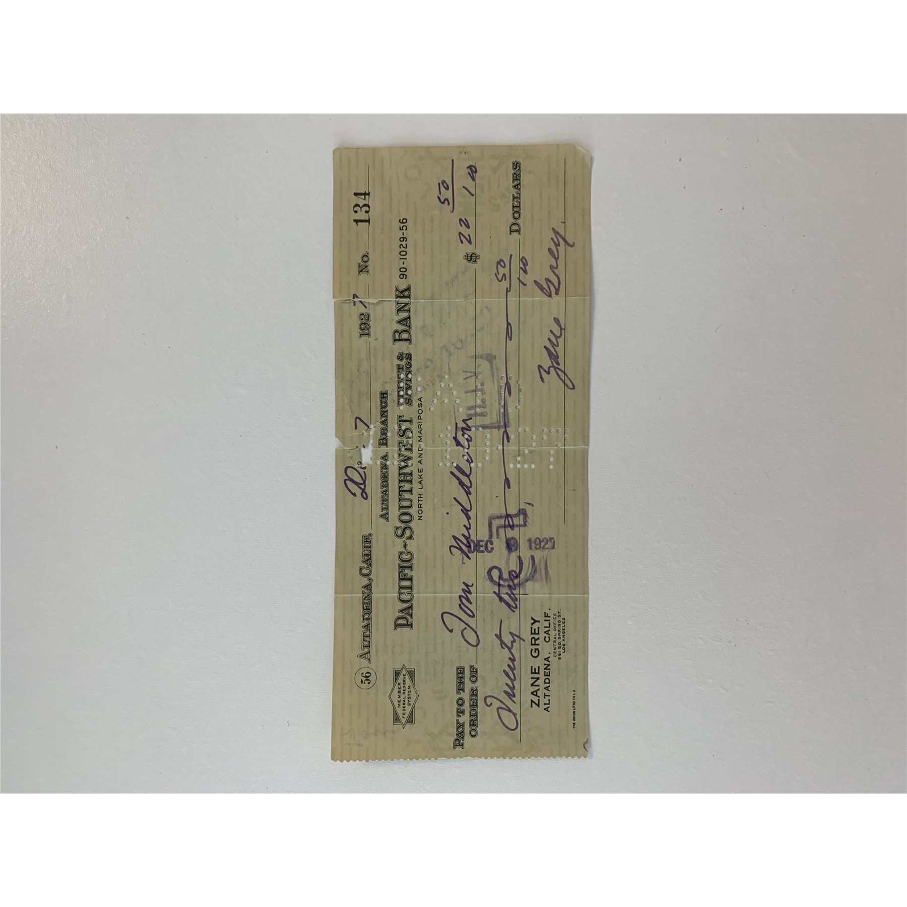 Zane Grey signed check. 2x6 inches