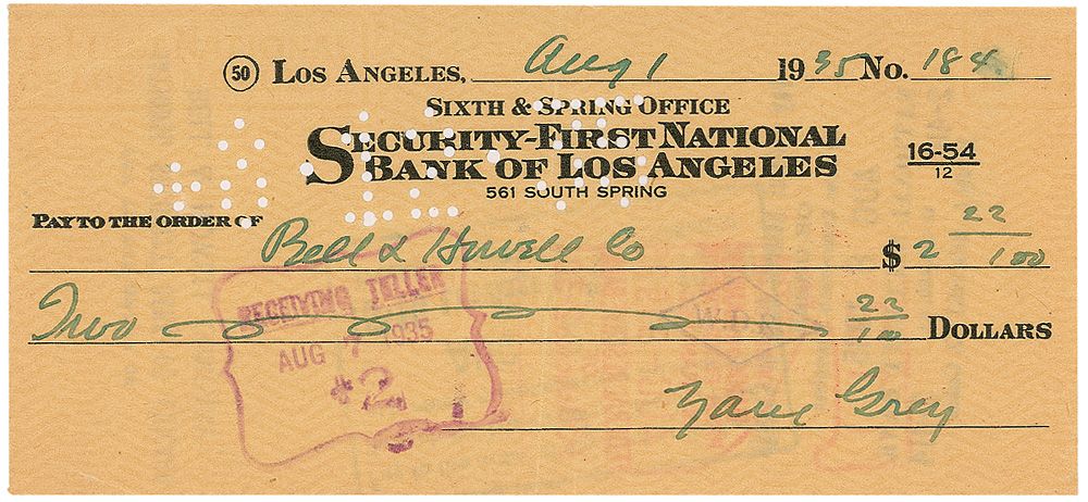 Bank check, 6 x 2.75, filled out and signed by Grey, payable to Bell & Howell Co. for $2.00, August 1, 1935. In fine condition, with central vertical fold, expected stamps and holes, and light-show-through from a stamp on reverse behind signature.