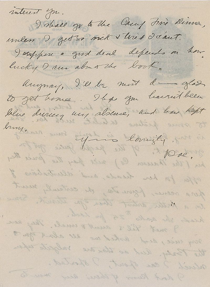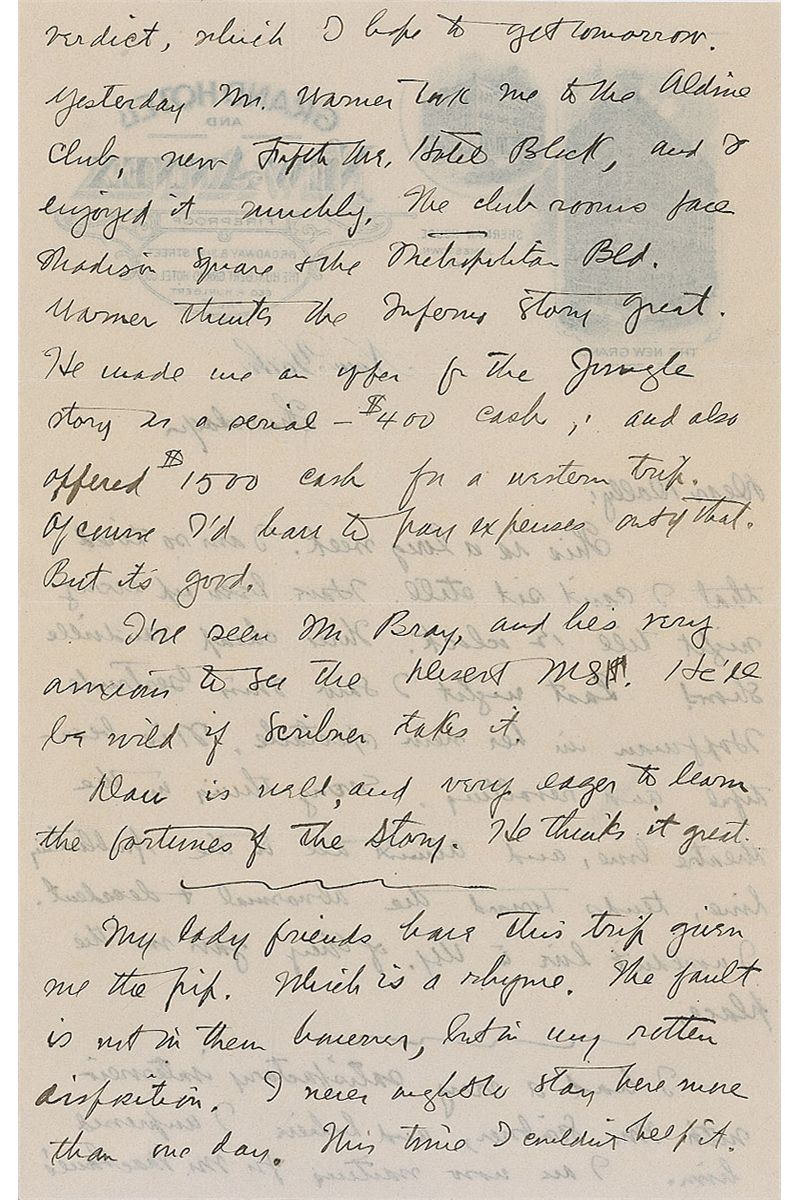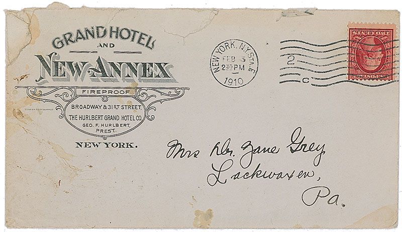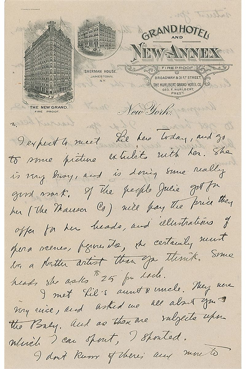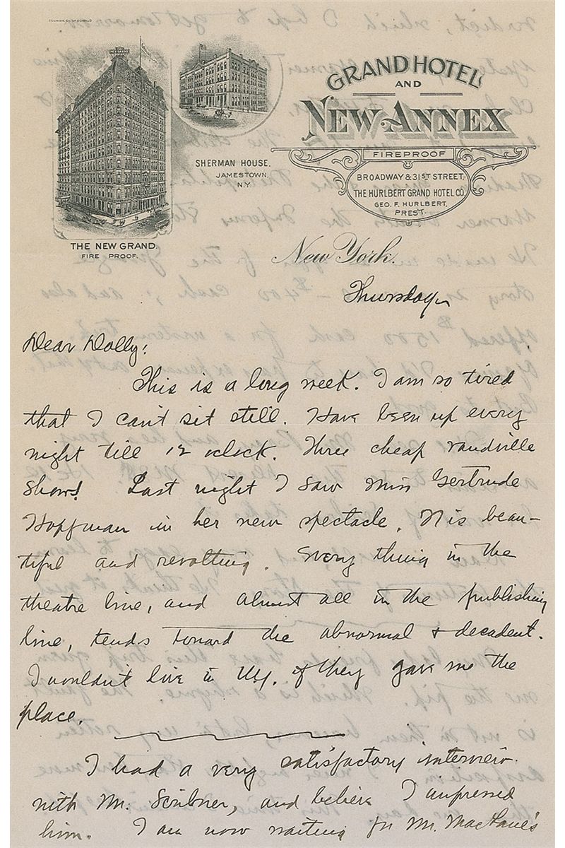 ALS signed “Doc,” two pages both sides, 6 x 9.25, illustrated Grand Hotel and New Annex letterhead, New York, February 3, 1910. Letter to his wife, Dolly. In part: “Every thing in the theatre line, and almost all in the publishing line, tends toward the a