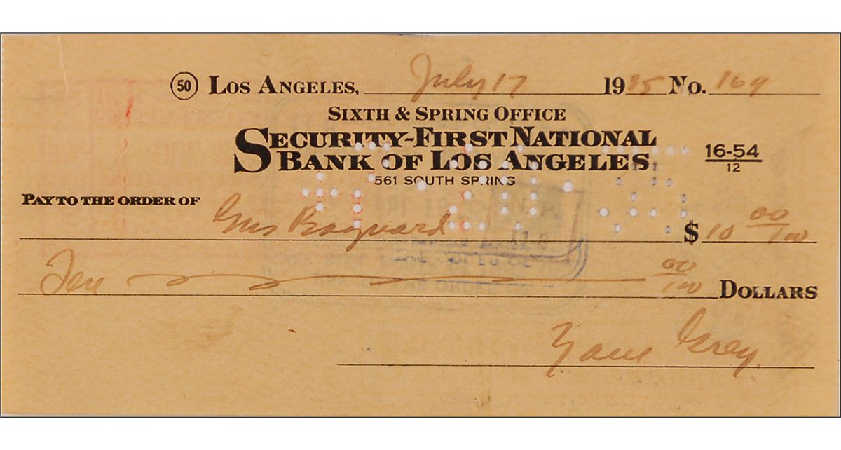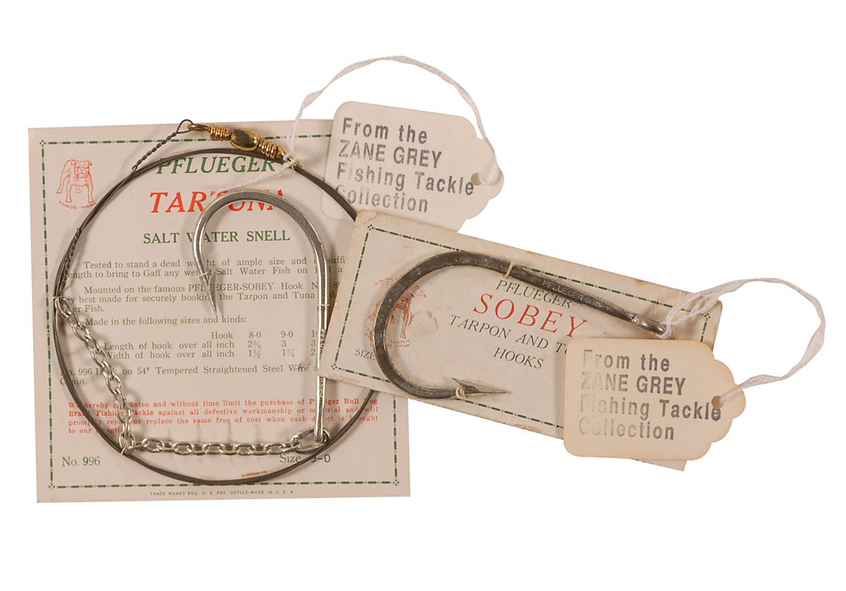 Bank check, 6 x 2.75, filled out and signed by Grey, payable to his cameraman and longtime friend Gus Bagnard for $10.00, July 17, 1935; and two unused Pflueger fish hooks, still attached to their original cards, which originate from Grey’s estate, with one bearing a tag which reads, “From the Zane Grey Fishing Tackle Collection,” the other with a tag reading “#196.” Accompanied by a letter of provenance from Brian J. McGrath, Editor of Fishing Collectibles Magazine. In part, “This item No. 196, described as Pflueger Sobey Hook 10/0 on card, is from a collection of fishing tackle bought by me from George Chamberlain [who] purchased this tackle…from a family member of Romer Grey, the eldest son of Zane Grey.” In very good condition, with expected cancellations and holes, scattered soiling, and mounting remnants to reverse.