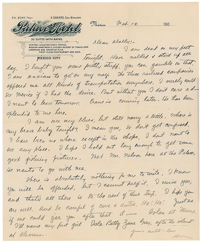ALS signed “Doc,” one page, 9 x 11, Palace Hotel, Mexico City letterhead, February 10, [1902]. Letter to his wife. In part: “Three railroad companies offered me all kinds of transportation anywhere. I surely could see Mexico if I had the desire. But without you I don’t car a d—…I hope I hold out long enough to get some good fishing pictures…I’ll name my first girl Isla Betty Zane Grey.” In fine condition, with intersecting folds.