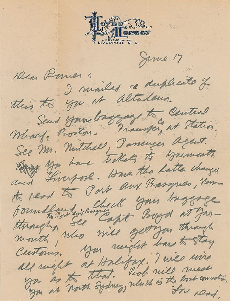 ALS, in pencil, signed “Dad,” one page, 8.25 x 10.75, Hotel Mersey letterhead, June 17. Letter to his son about travel arrangements. In part: “Send your baggage to Central Wharf, Boston. Transfer Co. at Station. See Mr. Mitchell, passenger agent. You have tickets to Yarmouth and Liverpool…See Capt. Boyd at Yarmouth, who will get you through customs.” In fine condition, with intersecting folds and some scattered light soiling.