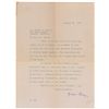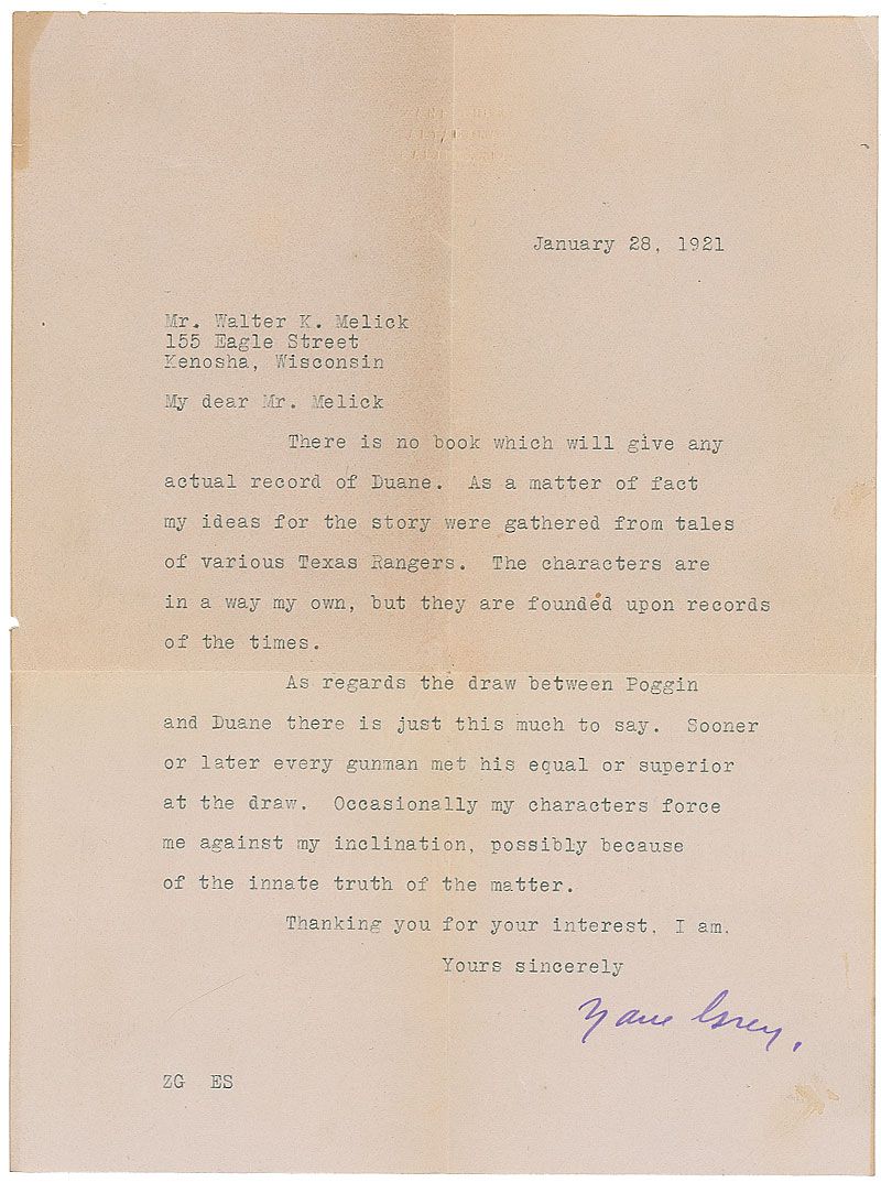 TLS, one page, 7 x 9.5, blindstamped personal letterhead, January 28, 1921. Letter to Walter K. Melick. In full: “There is no book which will give any actual record of Duane. As a matter of fact, my ideas for the story were gathered from tales of various Texas Rangers. The characters are in a way my own, but they are founded upon records of the times. As regards to Poggin and Duane there is just this much to say. Sooner or later every gunman met his equal or superior at the draw. Occasionally my characters force me against my inclination, possibly because of the innate truth of the matter.” Central vertical and horizontal folds, light toning, and a stain to the upper left corner, otherwise fine condition. Duane and Poggin appear in The Lone Star Ranger, Grey’s popular 1915 Western novel that was later adapted to both film and radio.
