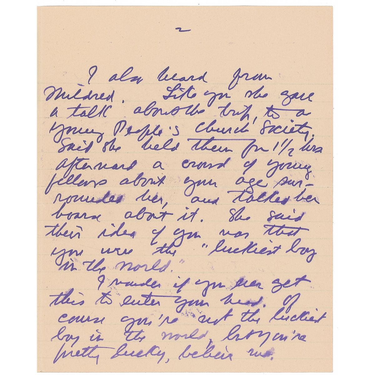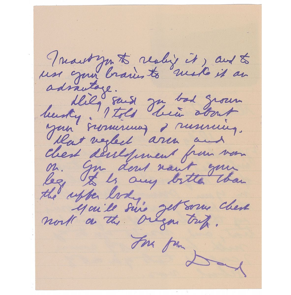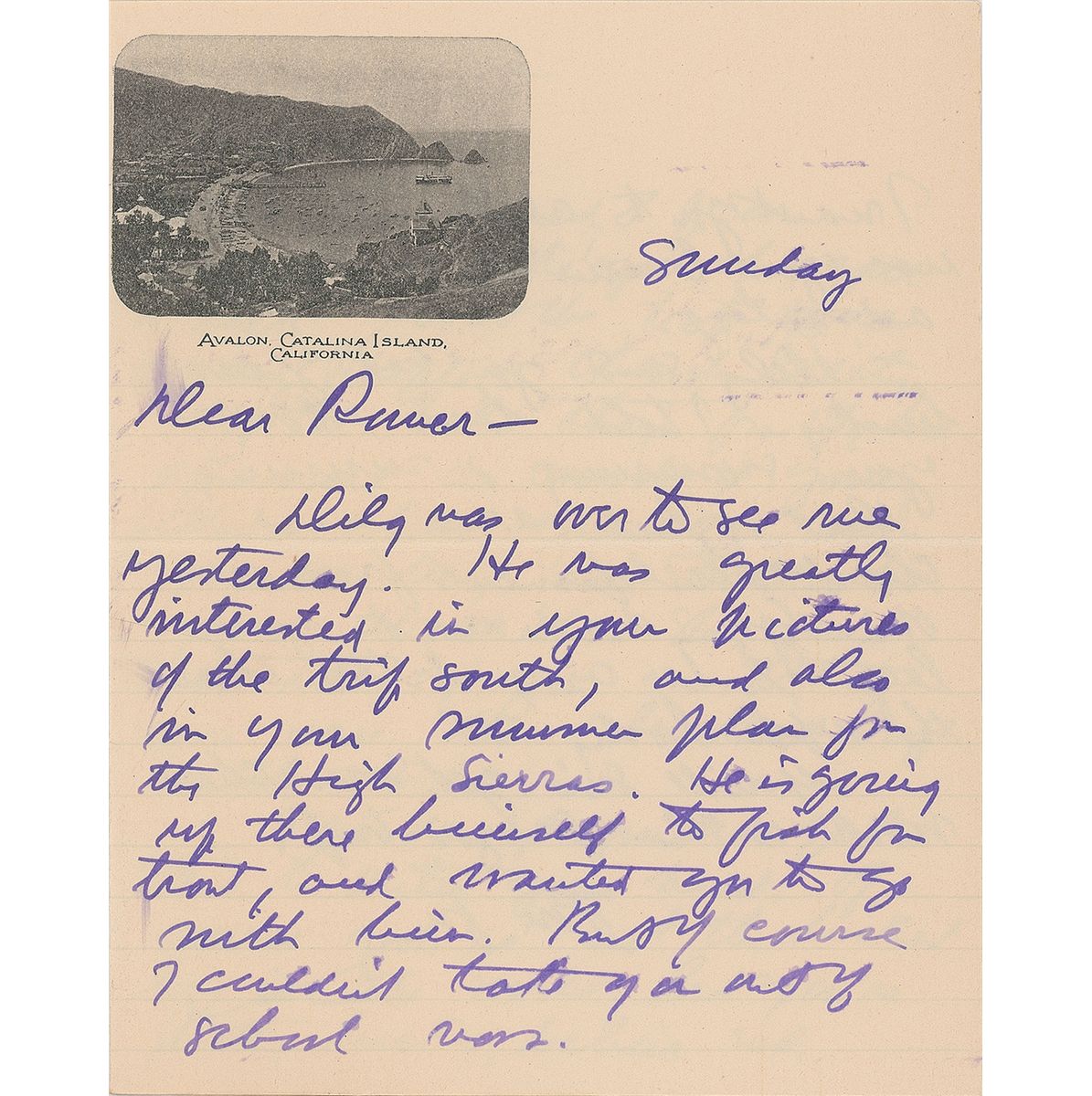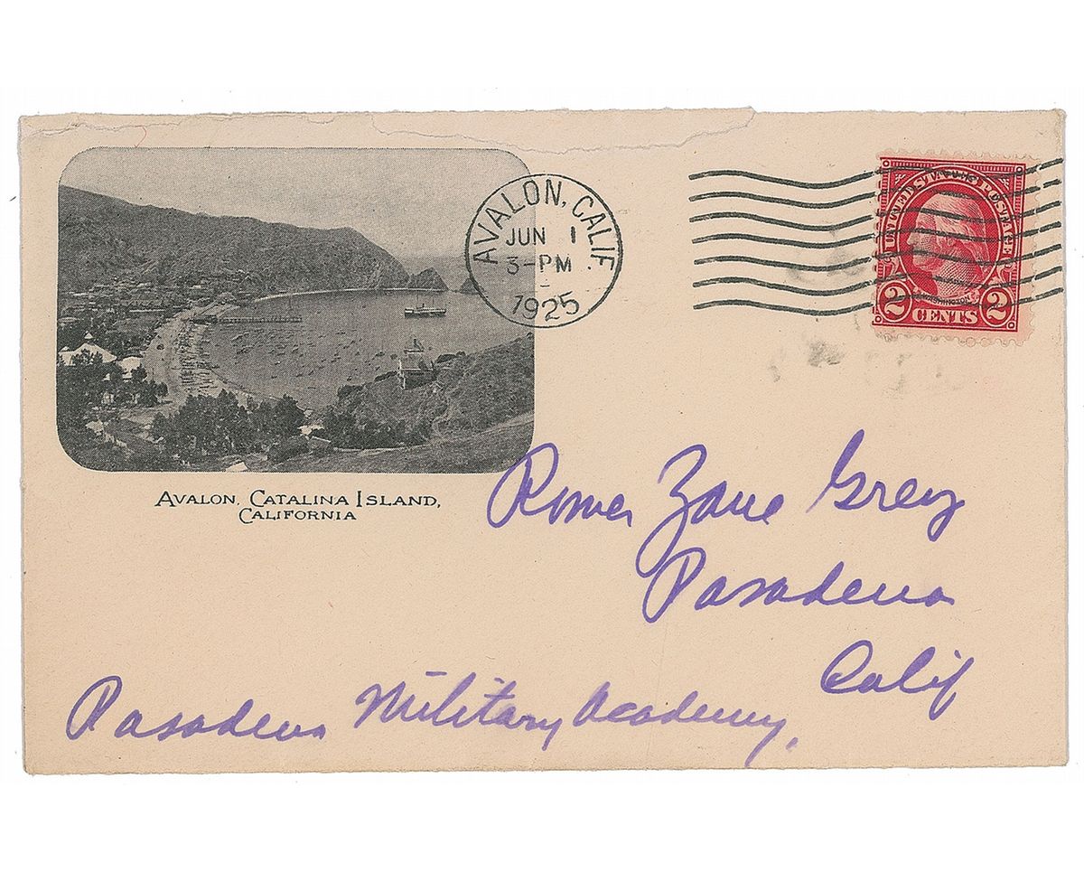 ALS signed “Dad,” three pages on two adjoining sheets, 5 x 6.5, Catalina Island letterhead, June 1, 1925. Letter to his son Romer. In part: “I also heard from Mildred. Like you she gave a talk about the truth, to a young people’s church society. Afterward a crowd of young fellows about your age surrounded her…She said their idea of you was that you were the ‘luckiest boy in the world’…Of course you’re not the luckiest boy in the world, but you’re pretty lucky, believe me.” In fine condition, with a few slight brushes to ink. Accompanied by the original mailing envelope, addressed in Grey’s hand.