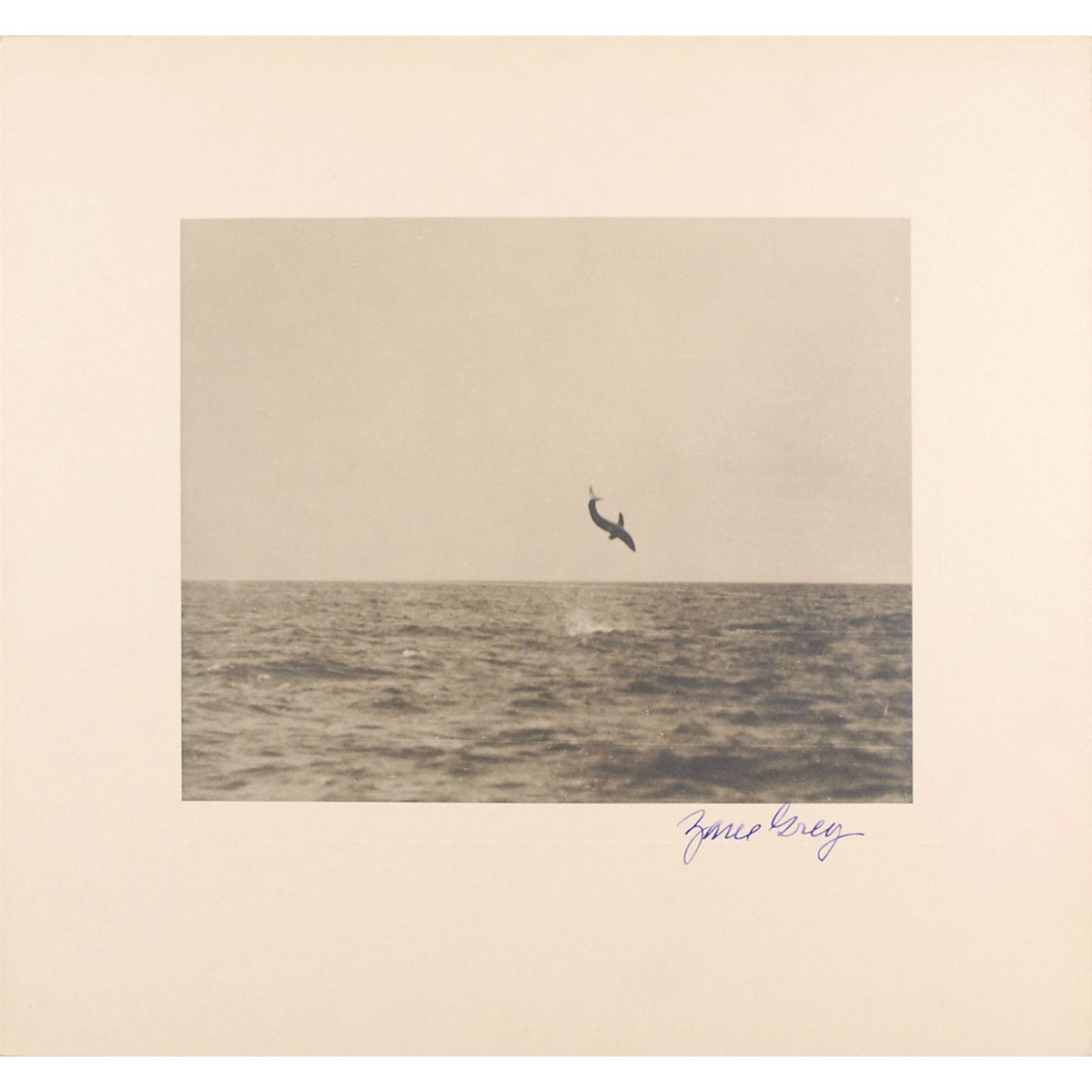 Fantastic matte-finish 15 x 14 photo of a fish leaping out of the ocean, signed below the image in Grey’s typical purple fountain pen. Affixed to a same-size mount. In fine condition. Grey was an enthusiastic photographer throughout his life and documented many of his worldwide journeys, including his famous fishing trips. This wonderful photograph likely originates from one such voyage and would be a perfect companion to the Grey manuscript offered in lot 531,in which he poetically describes a leaping yellow fin tuna.
