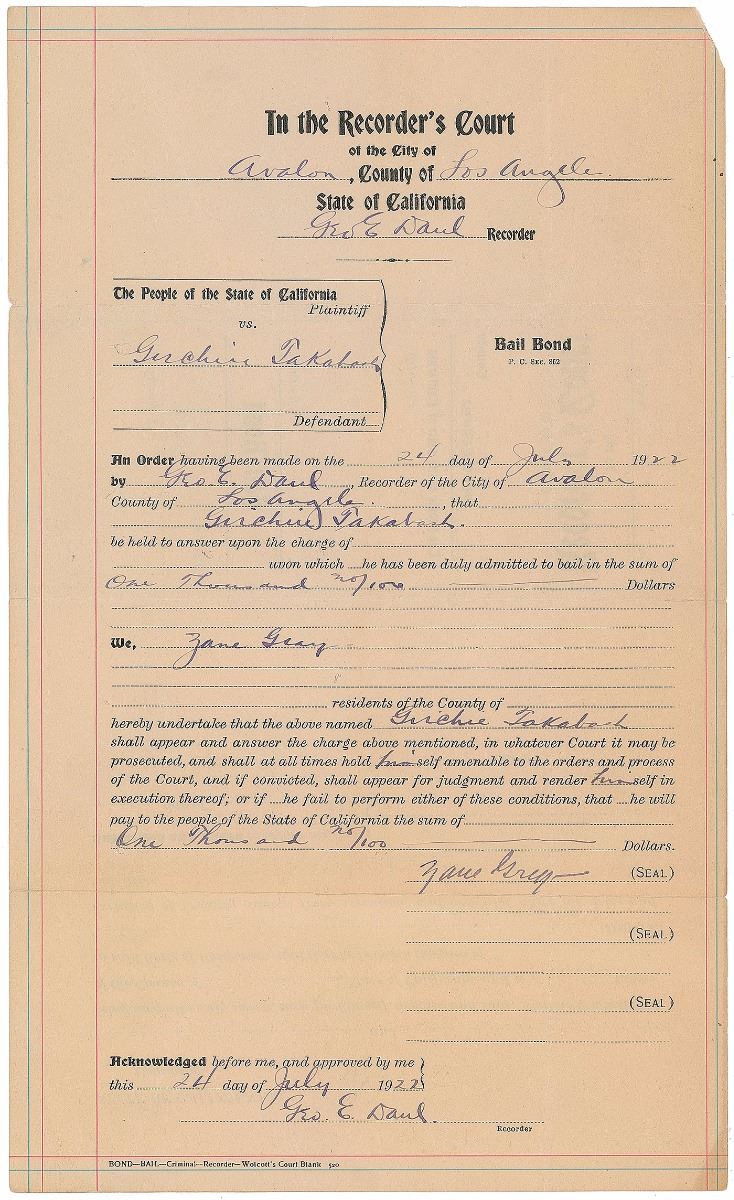Partly-printed DS, one page, 8.5 x 14, July 24, 1922. Los Angeles county bail bond for Girchie Takabash in which Grey agrees to “pay to the people of the State of California the sum of One Thousand…Dollars.” Signed at the conclusion by Grey. In fine condition, with scattered creasing and a missing upper right corner tip.