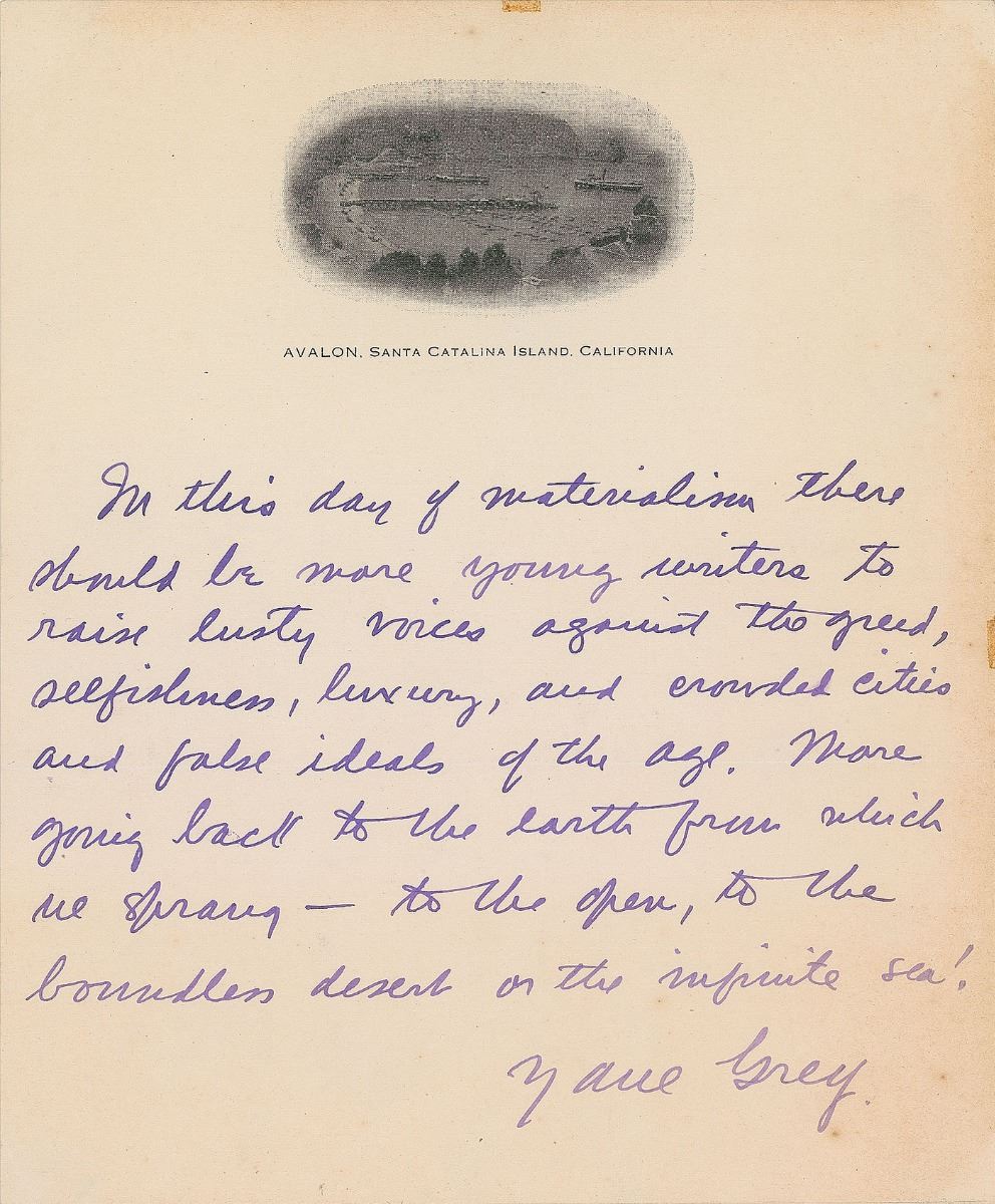 AQS on an off-white 7 x 8.5 sheet of letterhead with a vignette of Avalon on Santa Catalina Island, signed at the conclusion by Grey. In full: “In this day of materialism there should be more young writers to raise lusty voices against the greed, selfishness, luxury, and crowded cities and false ideals of the age. More going back to the earth from which we sprang—to the open, to the boundless desert or the infinite sea!” In fine condition, with trimmed edges and light toning.