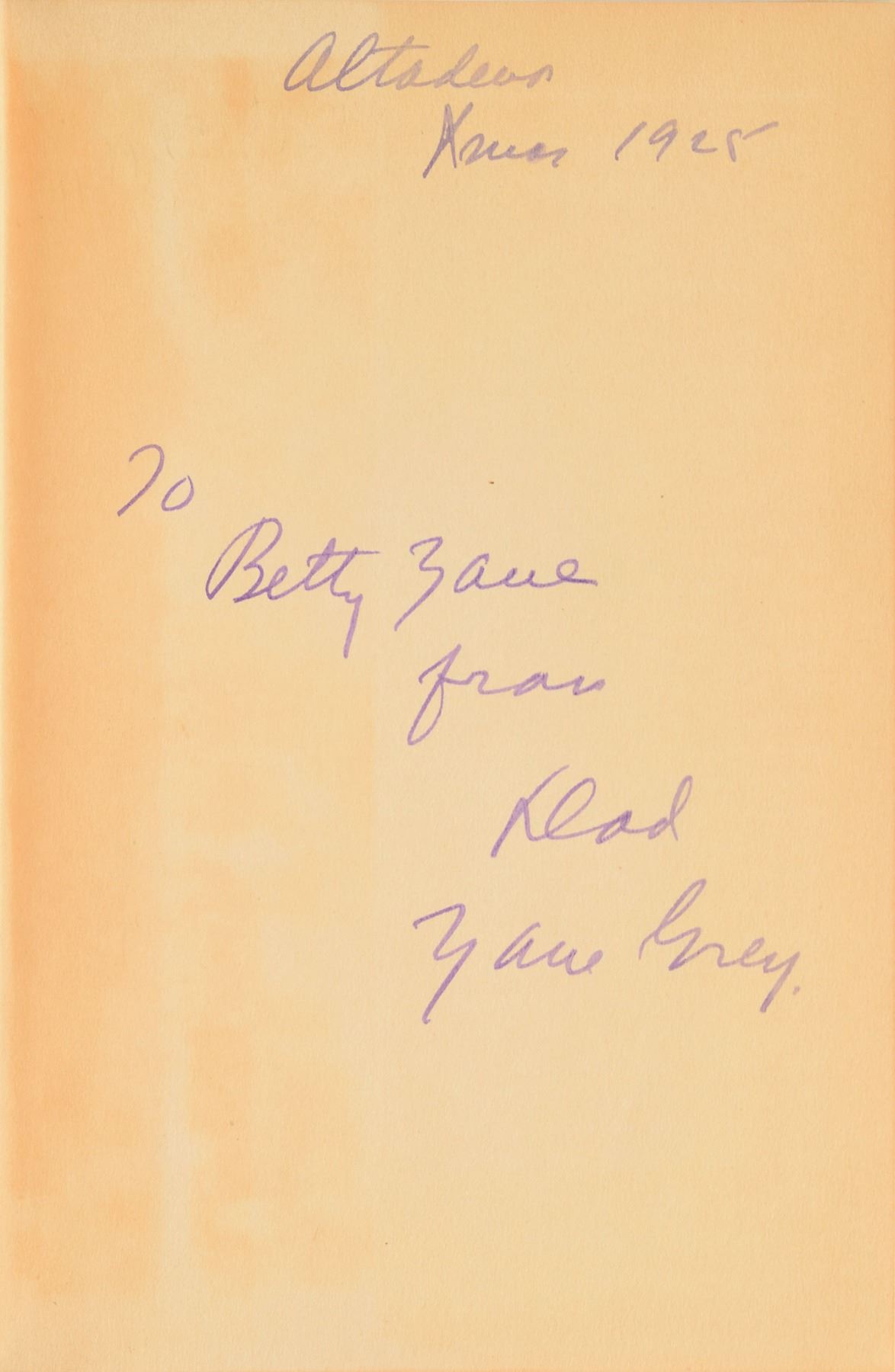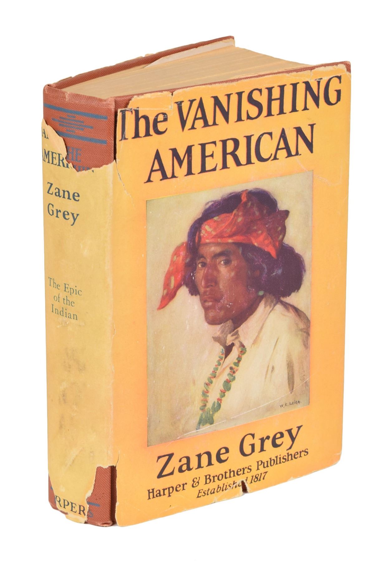 Signed book: The Vanishing American. First edition. NY: Harper & Brothers, 1925. Hardcover with dust jacket, 5.25 x 7.5, 308 pages. Signed and inscribed to his daughter on the first free end page in ink, "To Betty Zane, from, Dad, Zane Grey, Altadena, Xmas 1925." Autographic condition: very good to fine, with toning to the signed page. Book condition: VG/VG-, with moderate paper loss to the dust jacket, primarily to the spine.