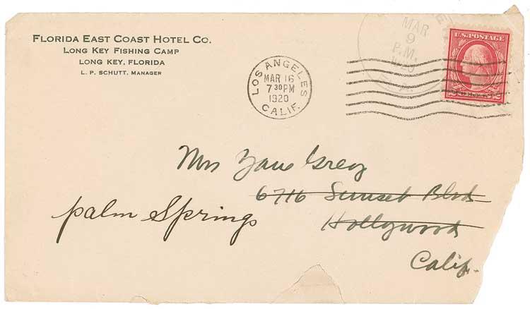 ALS signed “Zane,” one page, lightly-lined, 8.25 x 11, Florida East Coast Hotel Co. letterhead, March 9. Letter to his wife regarding plans on a house. In part: “Enclosed find plans Wilson sent to me. I did not ask him to do this, but I did ask him to look over the lot I wanted to build on…I am sure I want a nice comfy place…to mark there part of each year. You and I could always have a fine time there…We certainly need to save money. If we can just get money due us this year we’ll be solid.” Accompanied by the original mailing envelope, addressed in Grey’s hand to “Mrs. Zane Grey.” In fine condition, with intersecting folds, and a mild shade of overall toning. RRAuction COA.