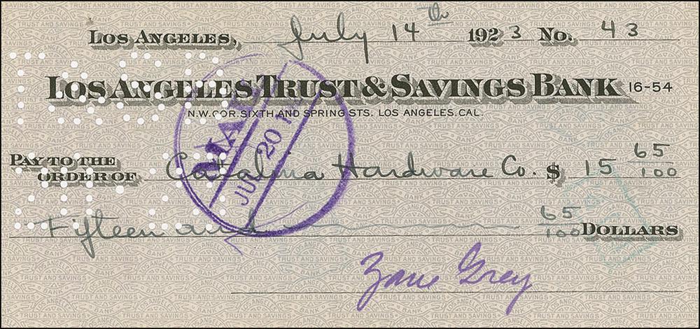 American writer (1872–1939) best known for such Western and adventure novels as Riders of the Purple Sage. Bank check, 5.75 x 2.75, filled out in another hand and signed in purple ink by Grey, payable to Catalina Hardware Co. for $15.65, July 14, 1923. In fine condition, with expected stamps and holes, none affecting the clean signature area.
