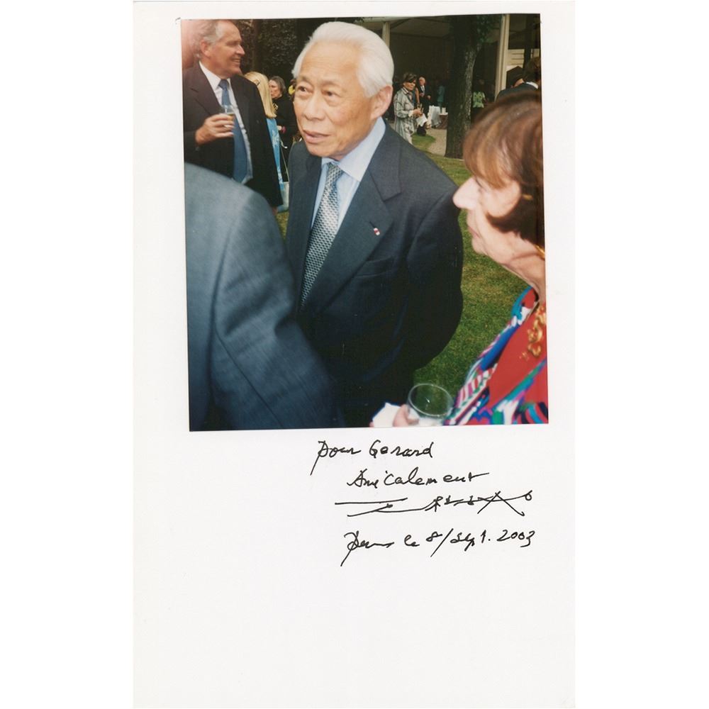 Ink signature of Zao Wou-Ki in Chinese, who adds in French, "Pour Gerard, Amicalement…Paris le…27 1. 2003,” on a white 5 x 7.75 sheet, which bears an affixed glossy photo of the artist. In very fine condition.