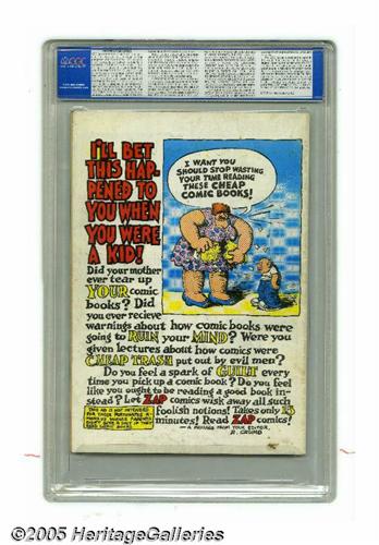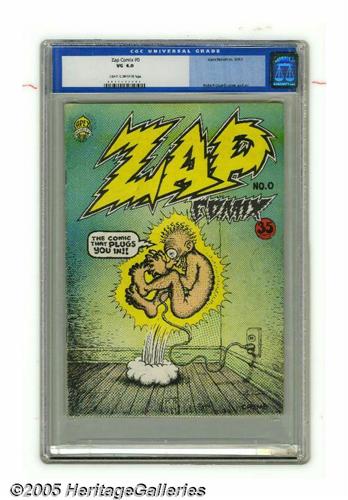 <B>Zap Comix #0 First Printing (Apex Novelties, 1967) CGC VG 4.0 Cream to off-white pages.</B></I> Robert Crumb's first attempt at creating a solo comic book almost didn't get published. He completed the art, handed it off to someone he thought he knew to publish it, and it was never seen again. After publishing another book as <B>Zap</B></I> #1, photocopies of this issue turned up, which Crumb re-inked and published as <B>Zap</B></I> #0. This is a scarce first printing, noted by the hairline mark in the lower part of the "Z". Jerry Weist's 2000 <B>Comic Art Price Guide</B></I> lists this edition with a VG 4.0 value of $350. CGC census, 3/40: 2 in 4.0, 10 higher.
