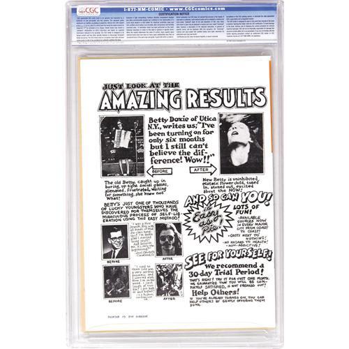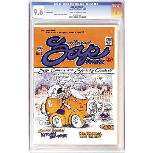 <B>Zap Comix #1 - Second Printing (Apex Novelties, 1967) CGC NM+ 9.6 Cream to off-white pages.</B></I> This is a second printing of the historic Zap #1, also called "the Donahue edition" which featured the solo work of Robert Crumb. Spain Rodriguez, S. Clay Wilson, Robert Williams, Gilbert Shelton, Rick Griffin, and Victor Moscoso would come aboard by the second issue. One of four copies of this rare book that are currently ranked as the highest graded by CGC - and when you consider these books were printed, folded, and stapled by hand, it's amazing that any of these even survived in high enough grade to be slabbed. Truly the most significant Underground comic ever published. Adult content. Fogel's Underground Comix Price Guide NM 9.4 value = $500. CGC census 7/06 (for the second printing): 4 in 9.6, none higher. <BR><BR><B>Important notice:</B> Heritage usually auctions material at the rate of 200-250 lots per hour. On some occasions eBay Live bid software or the Internet may not be able to keep up with the pace of the auction. We recommend placing a realistic absentee bid now as insurance to avoid disappointment. Occasionally the auctioneer may eliminate or reject an eBay Live bid, and the auctioneer may also reopen a lot after the close of the eBay live bidding (usually because we missed an audience bid), and may reject your bid even if it shows you as the winning bidder. By bidding via eBay Live, you agree that Heritage may award the lot to another bidder at its sole discretion under the circumstances described above or any other reasonable circumstances. Since eBay bids are not shown to us until we open the lot on the floor, we treat those bids just like floor bids. In most cases the floor responds before the eBay bid is presented to us, due to Internet lag time, so for consistency we have made it a policy that floor bids are always considered first over tie eBay live bids. Also please note that all Heritage lots purchased through eBay Live carry a 22.5% Buyer's Premium. Please make sure you read the Terms and Conditions before you bid. This lot is being auctioned in conjunction with a live floor auction by Heritage Auction Galleries. All final auction and invoice information will be supplied by Heritage Auction Galleries, and all other information should be considered preliminary. Lot:41001 <BR><BR><B>Winning Notification and Billing:</B> After the FINAL session in this auction is complete, Heritage will send e-mail and snail mail invoices. This process normally takes several days. All final auction and invoice information will be supplied by Heritage Auction Galleries, and all other information should be considered preliminary. <BR><BR>This auction will be conducted on a live auction floor and over the Internet through eBay Live. If you choose to place an absentee bid, please take a moment to <font color='#0000ff'><u><a href='http://pages.ebay.com/liveauctions/help/before/laabsentee.html'>learn how eBay Live absentee bidding works</a></u></font><font color='#000000'>