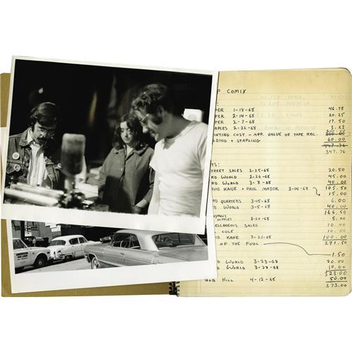 <B>Zap Comix #1 Publishing Archive Material (1968).</B></I> The history of Underground Comix may have to be rewritten with this lot! From the archives of Apex Novelties, founder and printer of the second edition copies of <B>Zap Comix</B></I> #1, comes this incredible treasure trove of information, receipts, notes, etc. from the halcyon days of Underground Comix, circa 1968. Donahue traded Charles Plymell a tape recorder (valued at the time at $200) for the offset printing press Plymell used to print the book that started it all - Robert Crumb's <B>Zap</B></I> #1. The story that circulated for years was that Robert and his first wife, Dana, took the freshly-printed copies of <B>Zap</B></I> #1 from Plymell and hawked them on the streets of San Francisco's Haight-Ashbury district from a baby carriage. We now know this is only partially true; it was actually Don Donahue, <I>not</B></I> Crumb, who was there with Dana. In fact, this lot includes the cash envelope from that day, with sales totals for Dana ($5.50), Don ($3.00 - slacker!) and Mimi ($12.00), dated 2/25/68. Also included in this historic lot is a photo of Donahue at his press, his receipts from various dealers for stacks of <B>Zap</B></I> #1, and copies of letters, photos, and a Jack Jackson eight-page comic story about the early days of Donahue's flat-mates, Rip Off Press (they all shared a loft in an old, condemned opera house in a bad part of town). Find out the costs of printing the second edition of <B>Zap</B></I>, and the share of the profits paid to Crumb (too little to print here without embarrassing the artist)! If the story of this fascinating chapter of comics history is your thing, here's a once-in-a-lifetime chance to own these rare archival items.