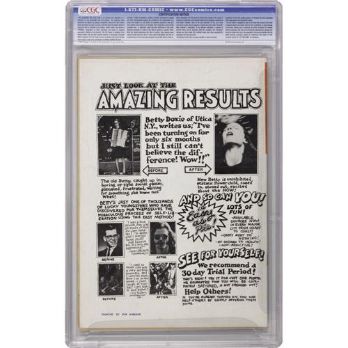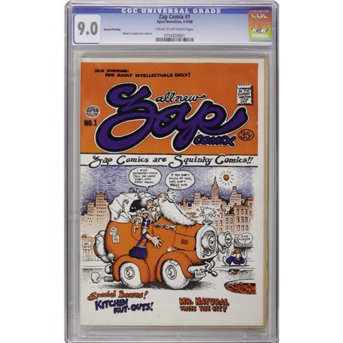 <B>Zap Comix #1 (Second Printing) (Apex Novelties, 1968) CGC VF/NM 9.0 Cream to off-white pages.</B></I> While there are earlier Underground Comix than <B>Zap</B></I> #1, this is the book that kick-started the genre. It's also the comic that brought Robert Crumb to world-wide prominence, and introduced his "Mr. Natural" character to many of his fans. Legend has it that copies were sold by Crumb and his then-wife Dana on the streets of San Francisco from a baby buggy. It has since been disclosed that publisher Don Donahue was standing in for Crumb, who was off doing, er… his "thing" at the time! A second printing <B>Zap</B></I> #1 is a little easier to find than a Plymell first edition, but not by much, especially a copy as nice as this one. Fogel's Underground Comix Price Guide NM value = $500. Adult themes.<BR><BR><b>Shipping:</b> Slabbed Comic (<a target="_blank" href="http://www.heritageauctions.com/common/shipping.php">view shipping information</a>)