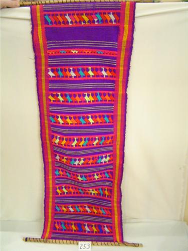 This hand woven Zapatec Weaving was collected in Oaxaca, Mexico in the 1970's. The 14.5" X 40" brightly-colored wool weaving, is attached to sticks, top & bottom, and is in excellent condition.