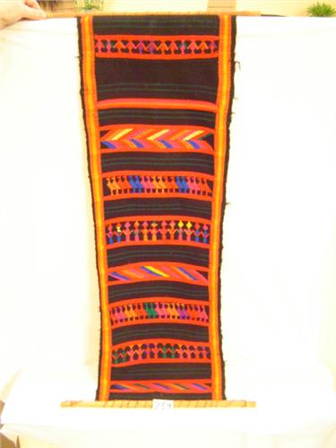 This hand woven Zapatec Weaving was collected in Oaxaca, Mexico in the 1970's. The 14.5" X 42" brightly-colored wool weaving, is attached to sticks, top & bottom, and is in excellent condition.