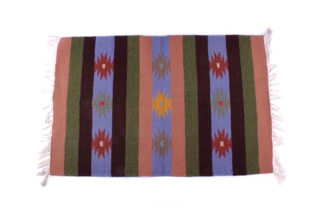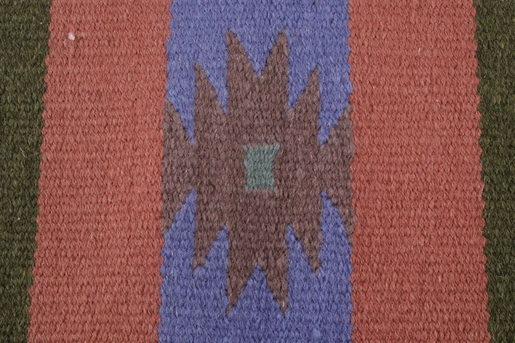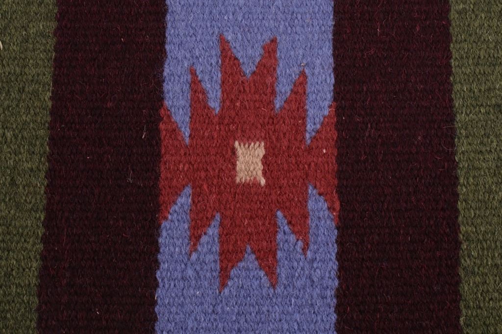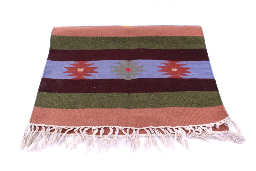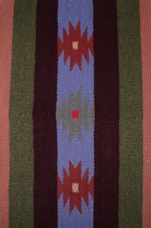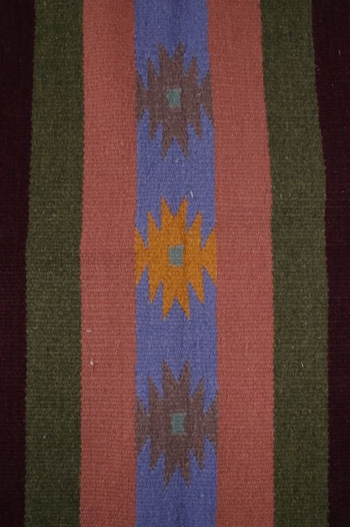 Featured in this lot is this Zapotec banded medallion Saltillo rug. The rug shows a wonderful traditional banded Saltillo design with crystal medallions adorning every fourth thick band of the rug, three per band. The rug features naturally dyed bands of brown, green, maroon, light blue and shows medallions of the same colors. The condition of this rug is good and like-new, with no obvious signs of damage. The measurements of this rug are 42 1/2" x 24".