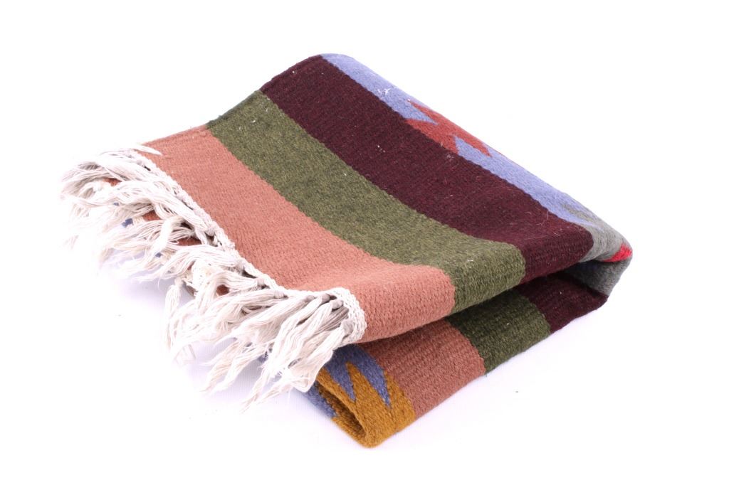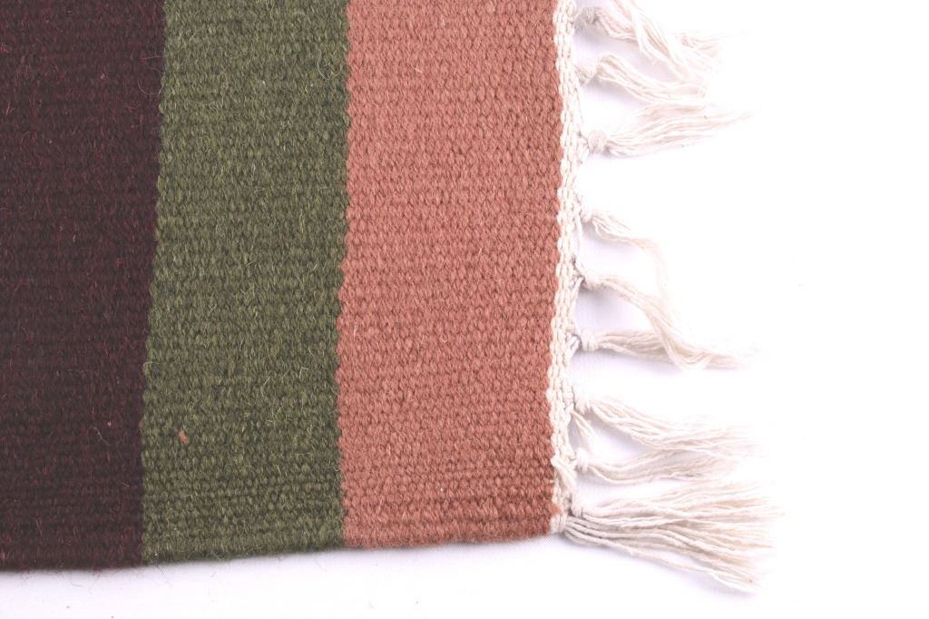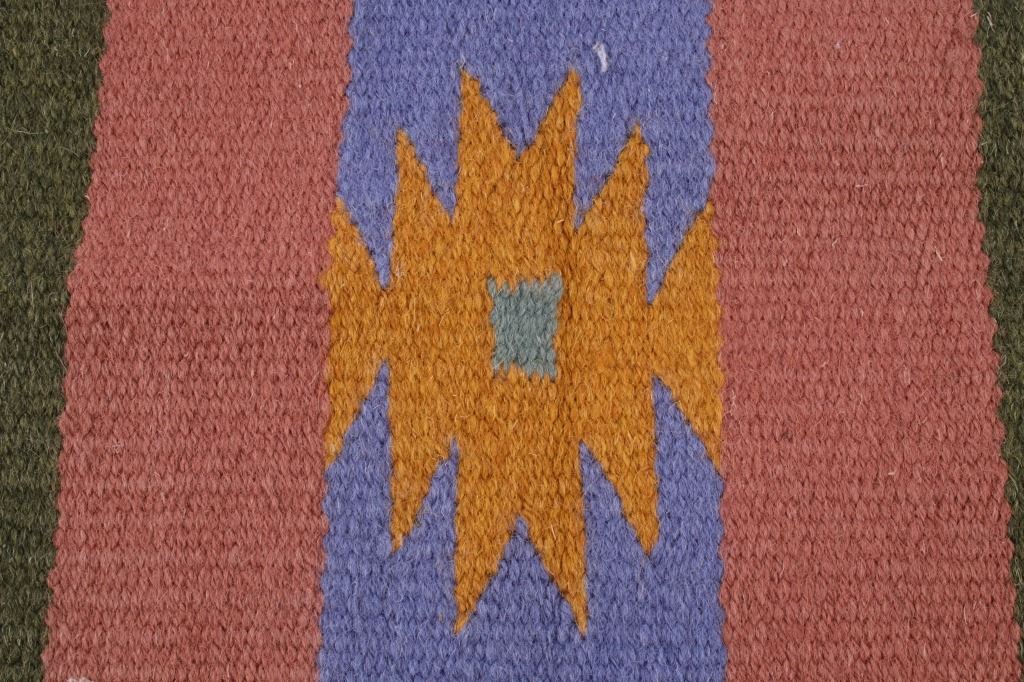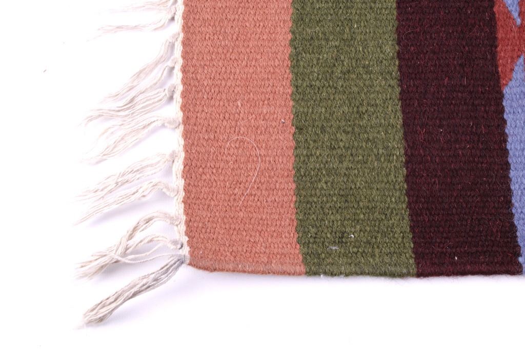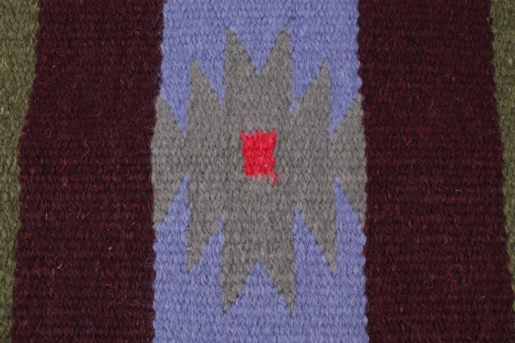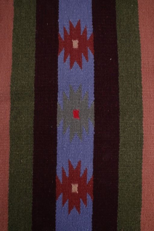 Featured in this lot is this Zapotec banded medallion Saltillo rug. The rug shows a wonderful traditional banded Saltillo design with crystal medallions adorning every fourth thick band of the rug, three per band. The rug features naturally dyed bands of brown, green, maroon, light blue and shows medallions of the same colors. The condition of this rug is good and like-new, with no obvious signs of damage. The measurements of this rug are 42 1/2" x 24".