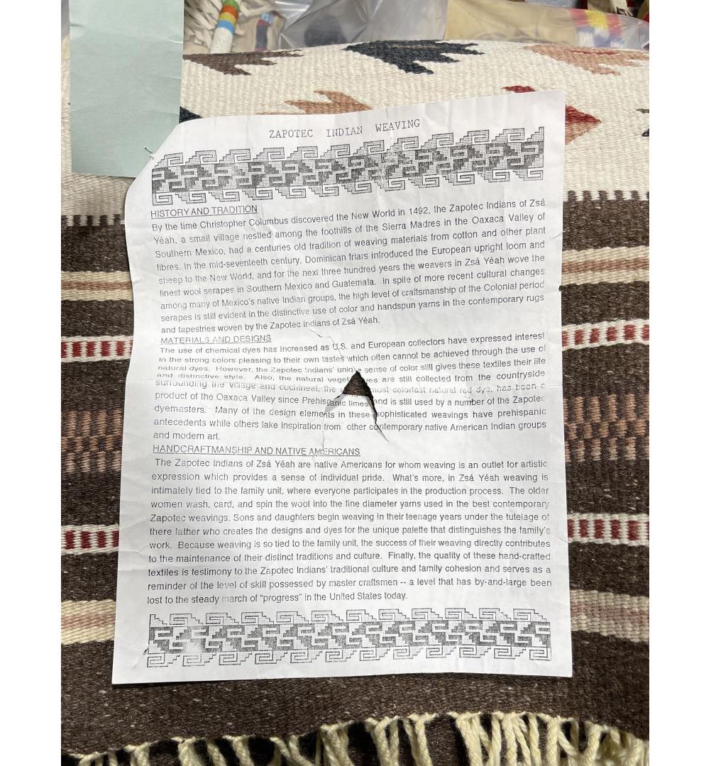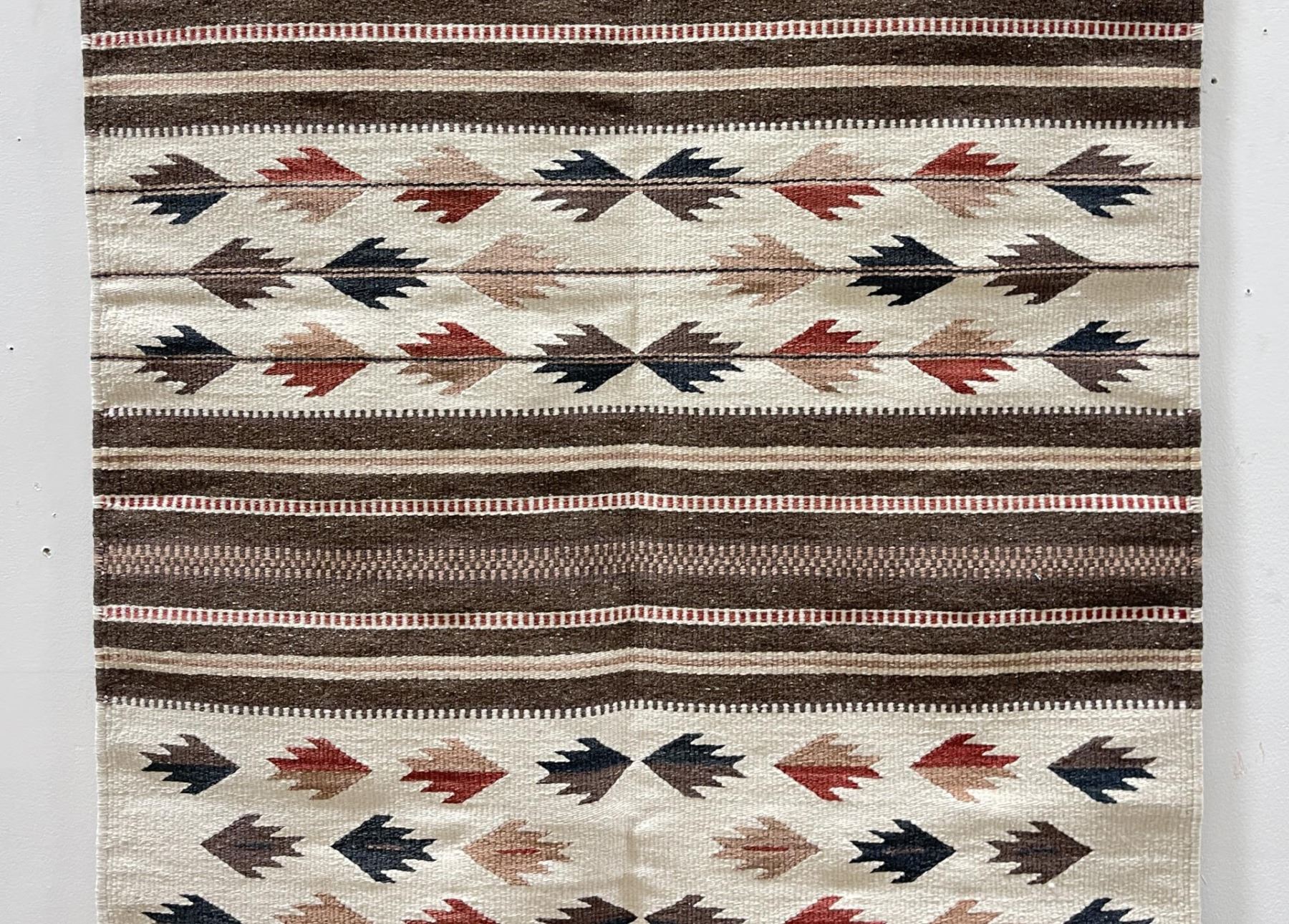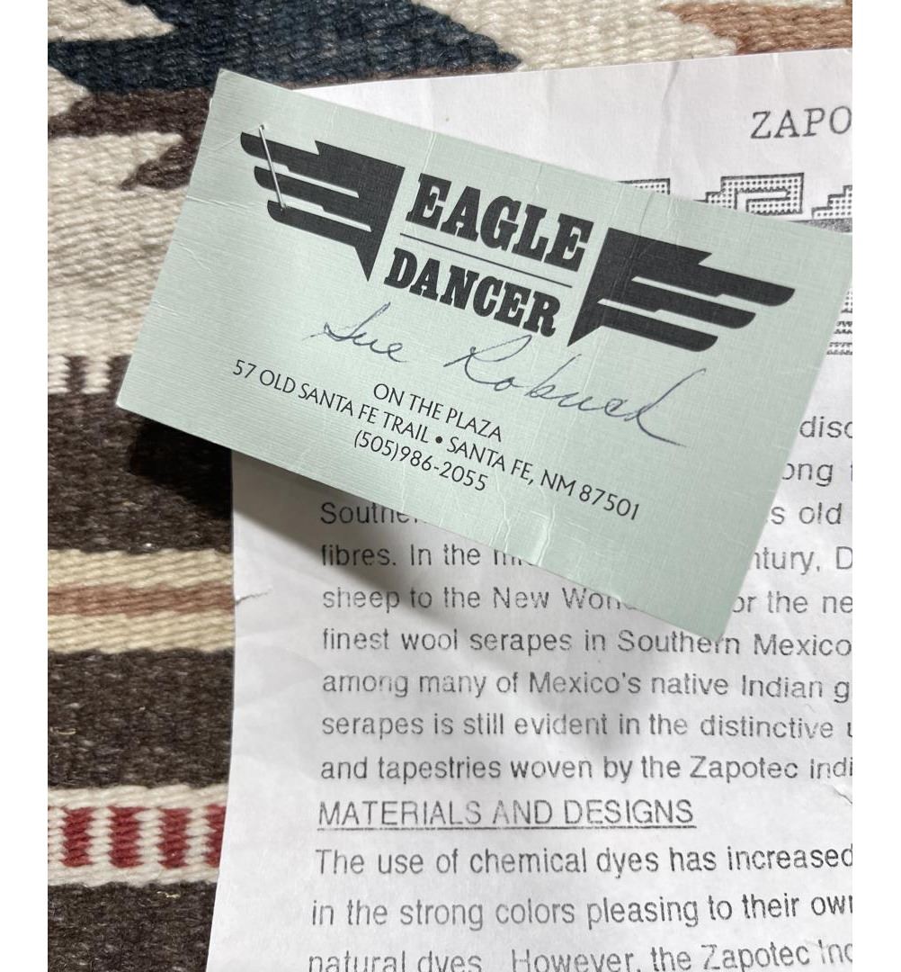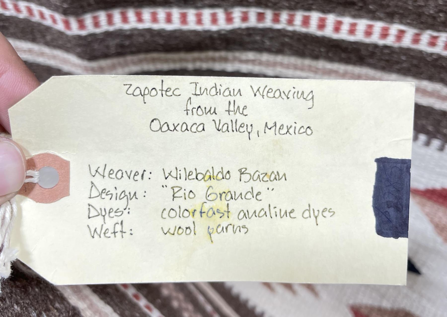 Weaving titled "Rio Grande" made with colorfast aniline dyes. Made in Oaxaca Valley, Mexico. Measures 32" x 59"