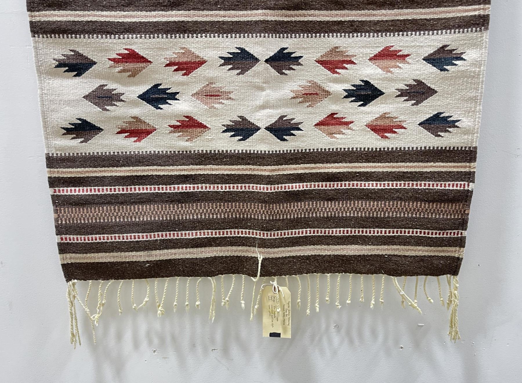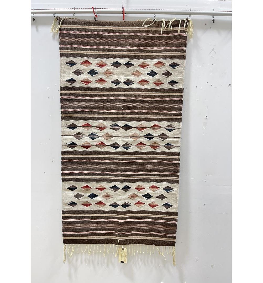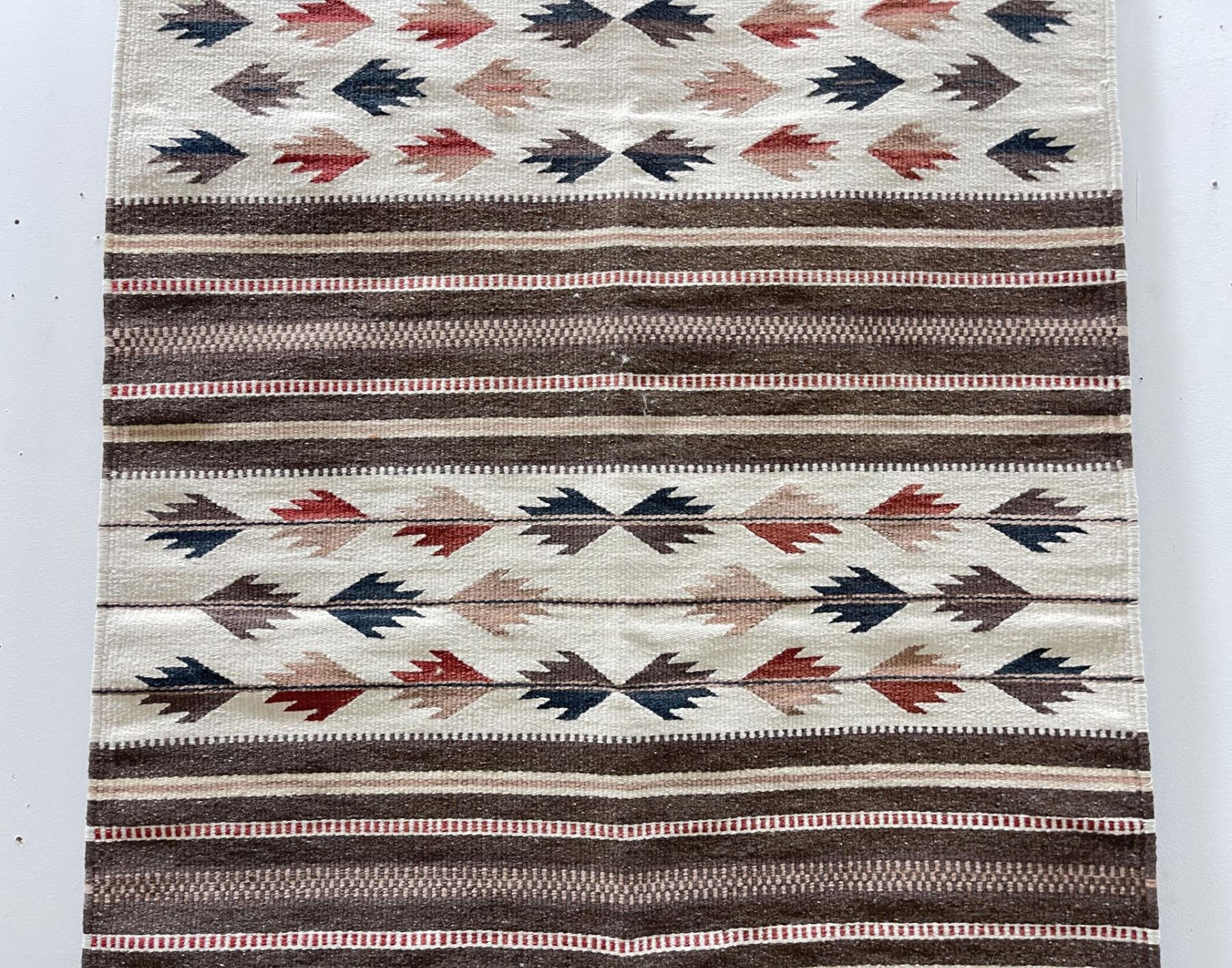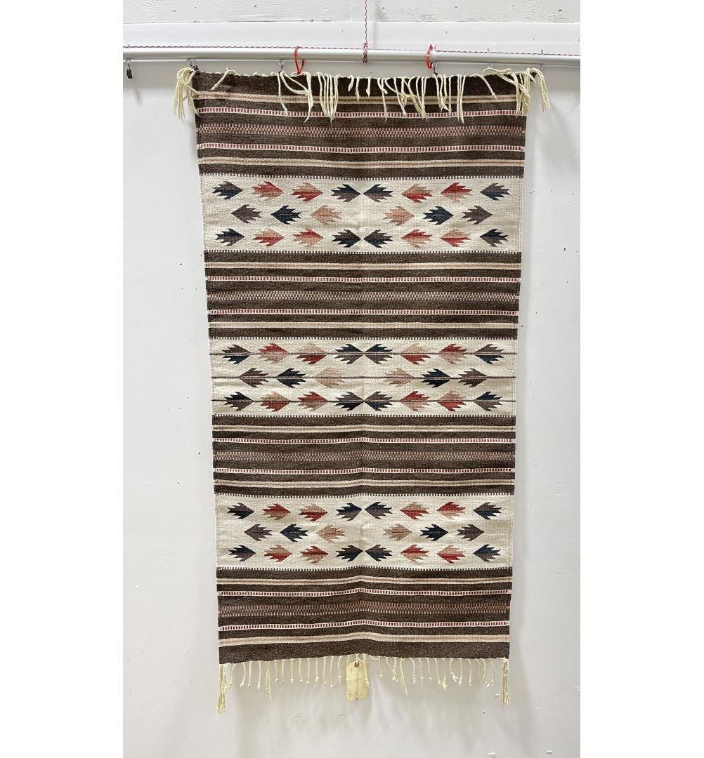 Weaving titled "Rio Grande" made with colorfast aniline dyes. Made in Oaxaca Valley, Mexico. Measures 32" x 59"
