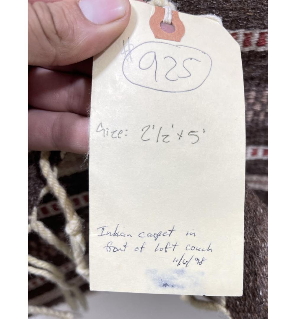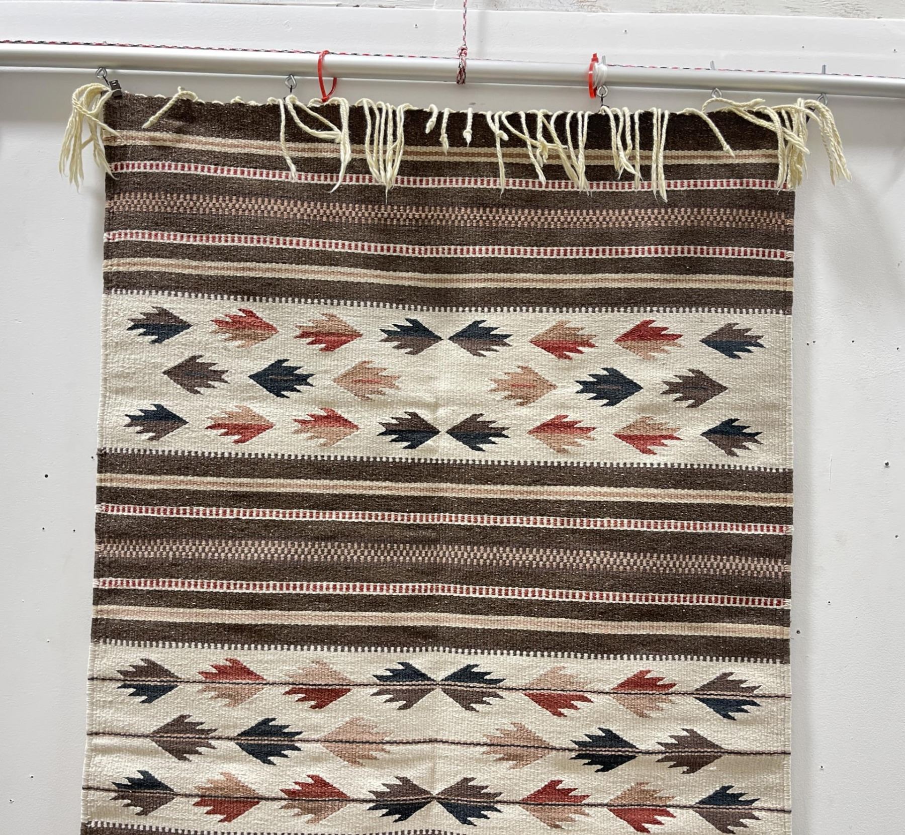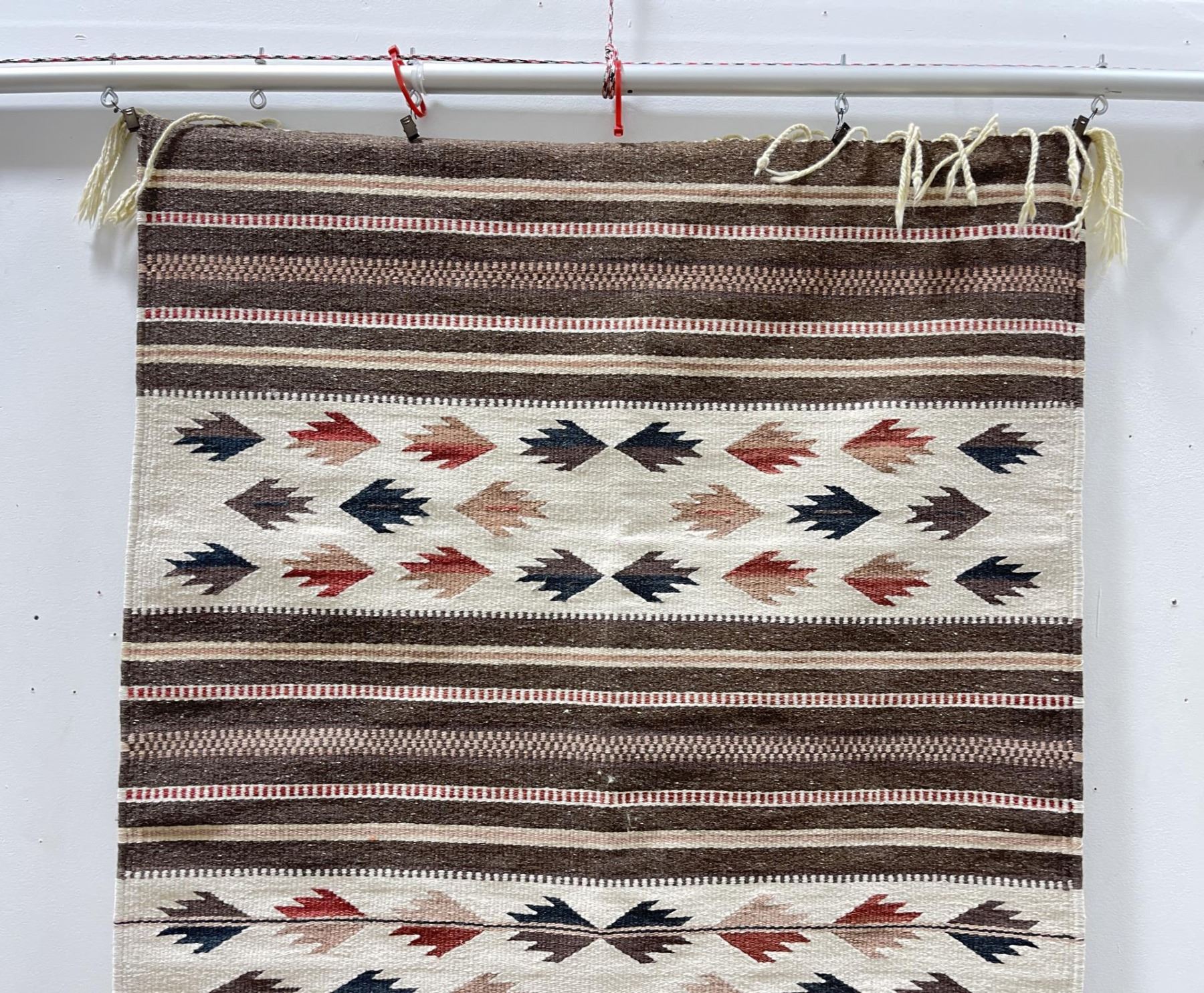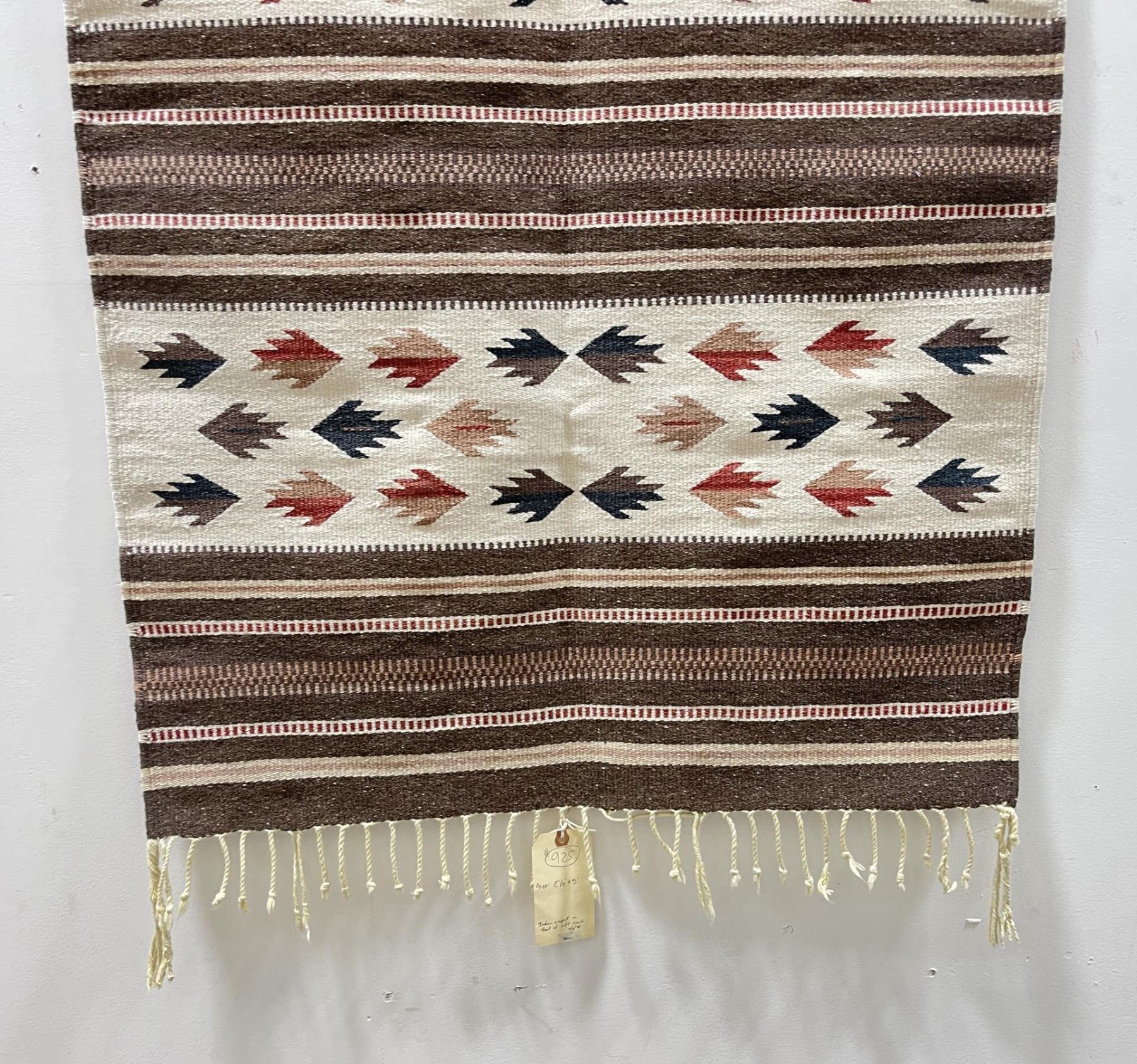 Weaving titled "Rio Grande" made with colorfast aniline dyes. Made in Oaxaca Valley, Mexico. Measures 32" x 59"