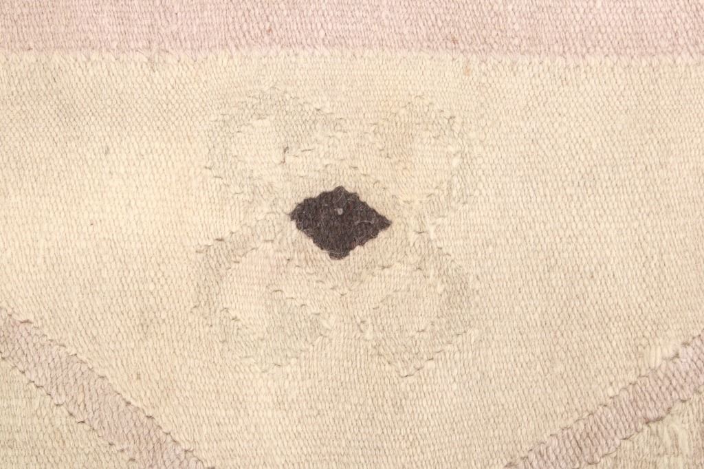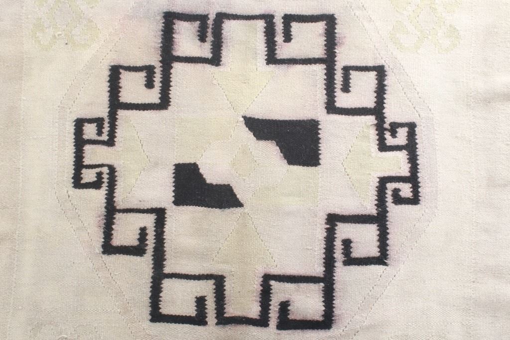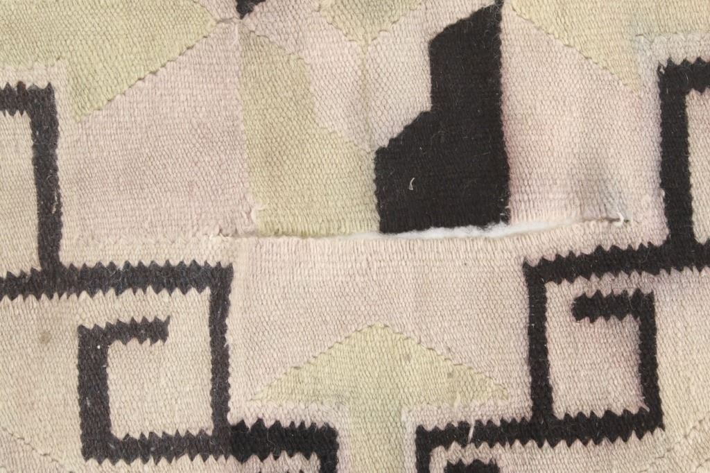 Featured in this lot is this Zapotec medallion Saltillo runner rug circa 1930's. The rug features a very long stature with two central medallion decorations symmetrically centered in the rug and shows a off white coloration with geometric patterns of light green and the medallions show black coloration. The runner ends shows tassels across the entire edge of the rug. The condition of this hand woven rug is poor with a heavy tear into the center of the rug and shows some wear to the integrity of other spots on the rug. The measurements of this rug are 93" x 38 1/4".