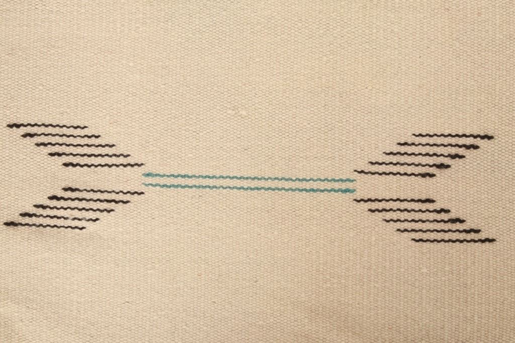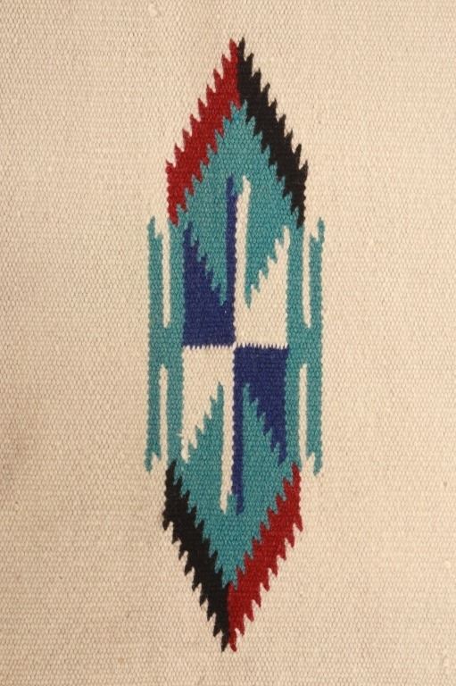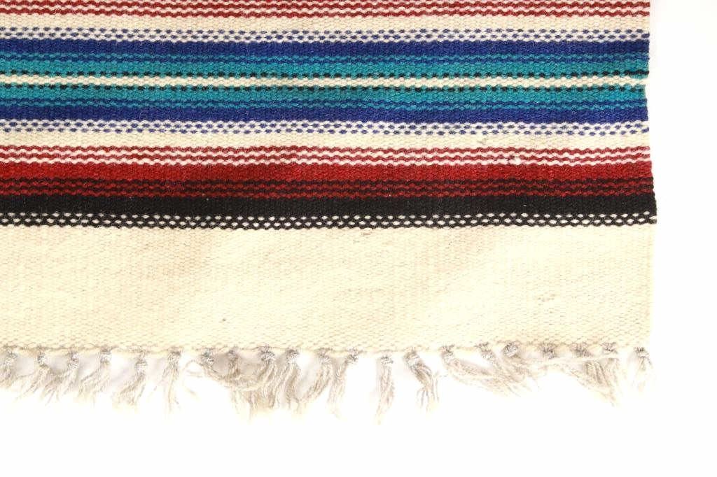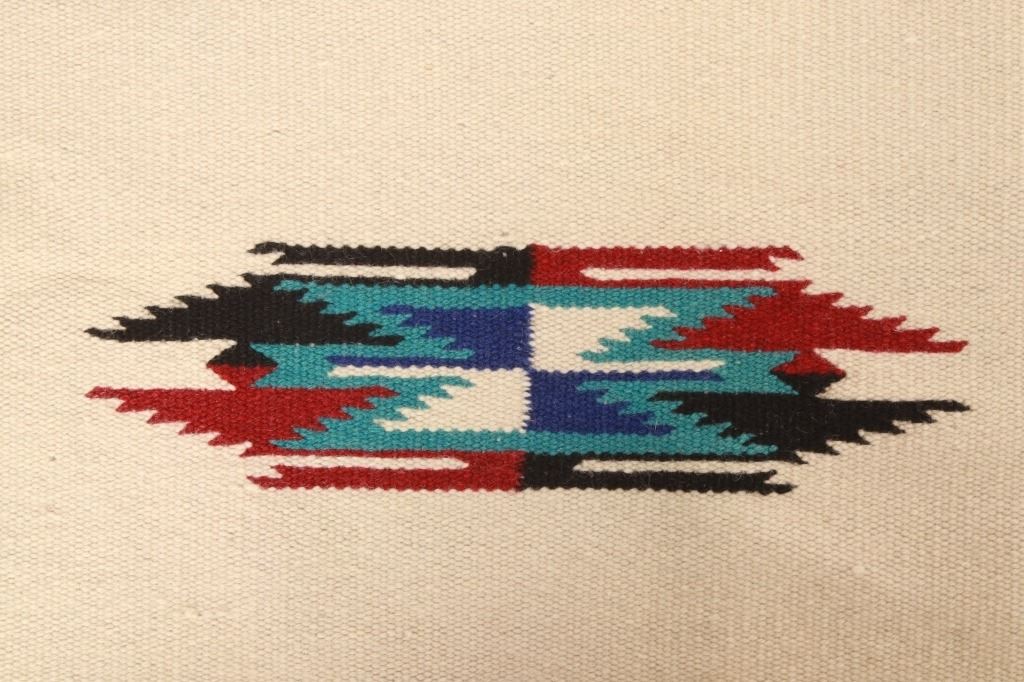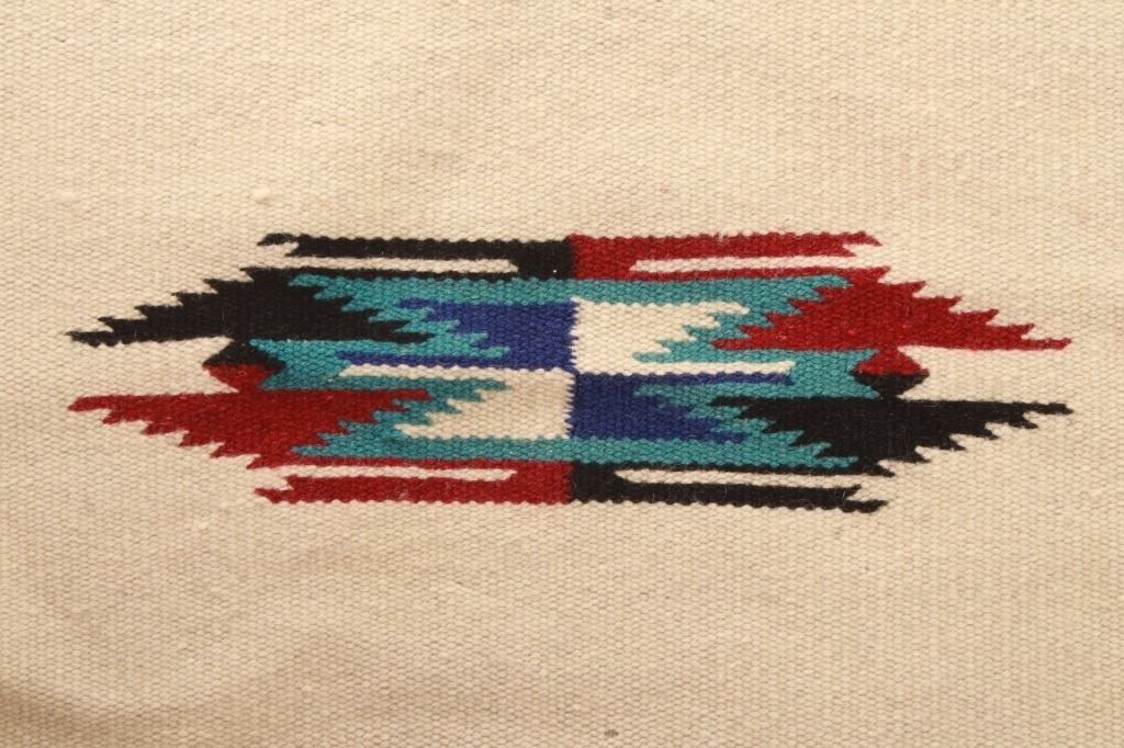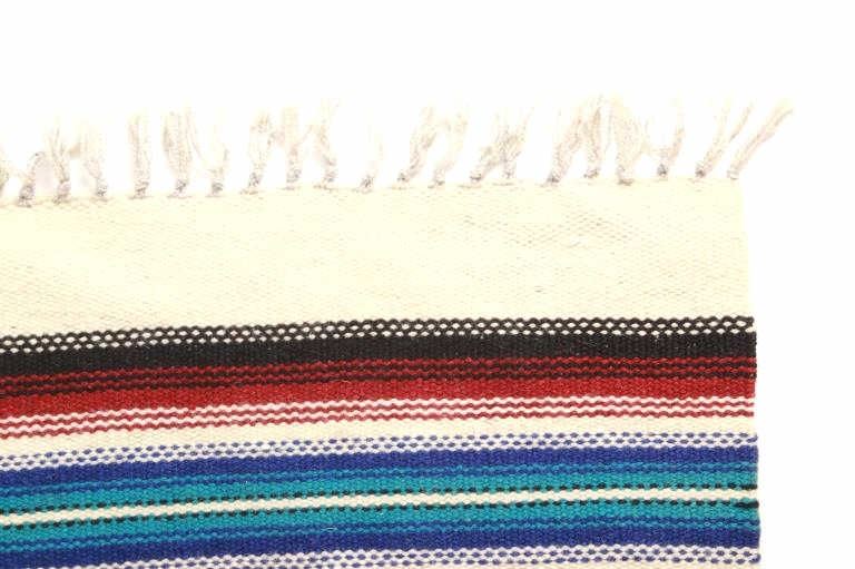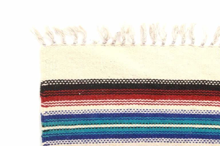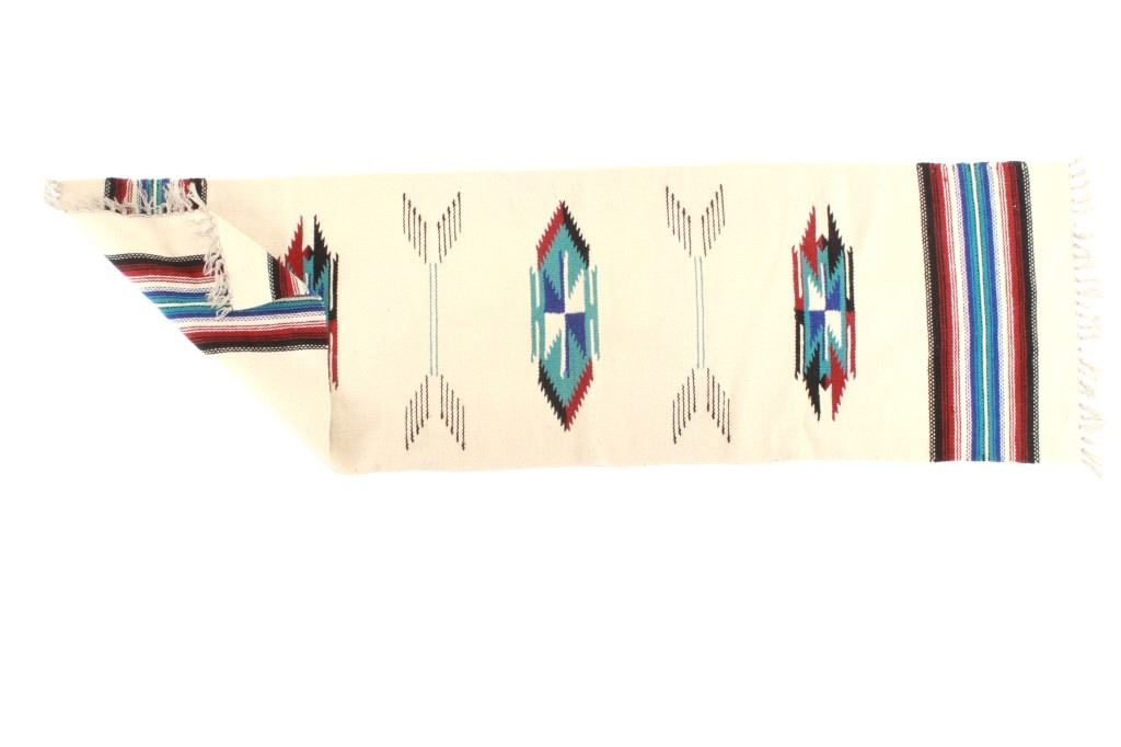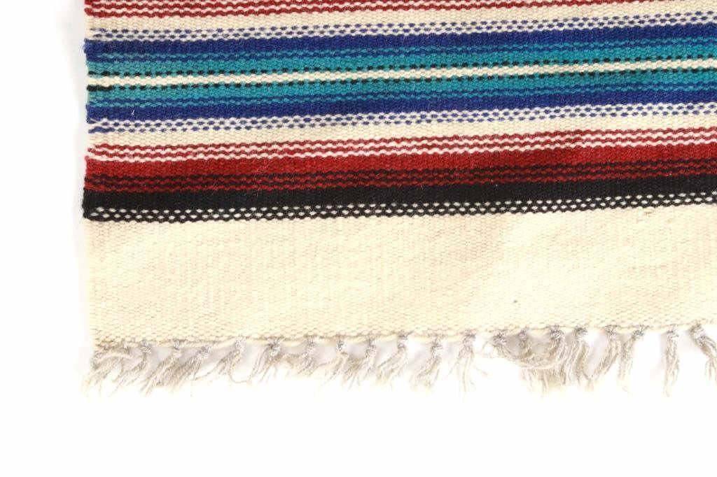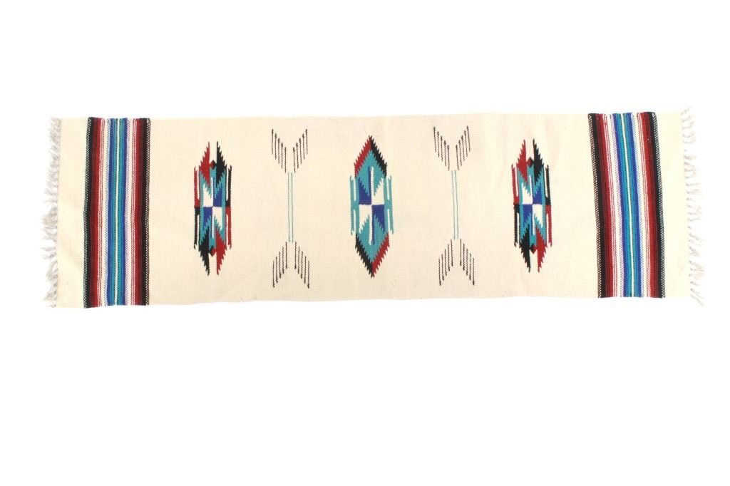 Featured in this lot is this montanitas Saltillo, wool Zapotec rug, circa 1960's. The rug shows a traditional Saltillo design with a wonderful geometric pattern associated with other montanitas Saltillo rugs. The rug features lovely coloration, displaying a cream field with bands of black, red, blue, and turquoise, geometric patterns, and natural grey tassels, adding to the theme of the rug. The condition of this rug is good, showing no obvious signs of damage. The measurements of this Zapotec rug are 59" x 18". The tight, handwoven weave shows bright rich colors in the fine Montanitas Saltillo pattern of the time-honored Zapotec, multi-generational craft.