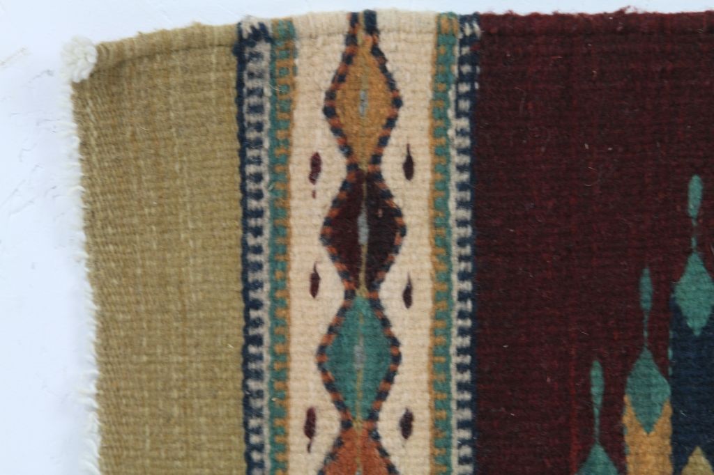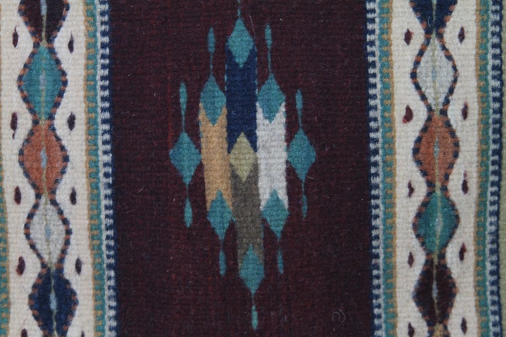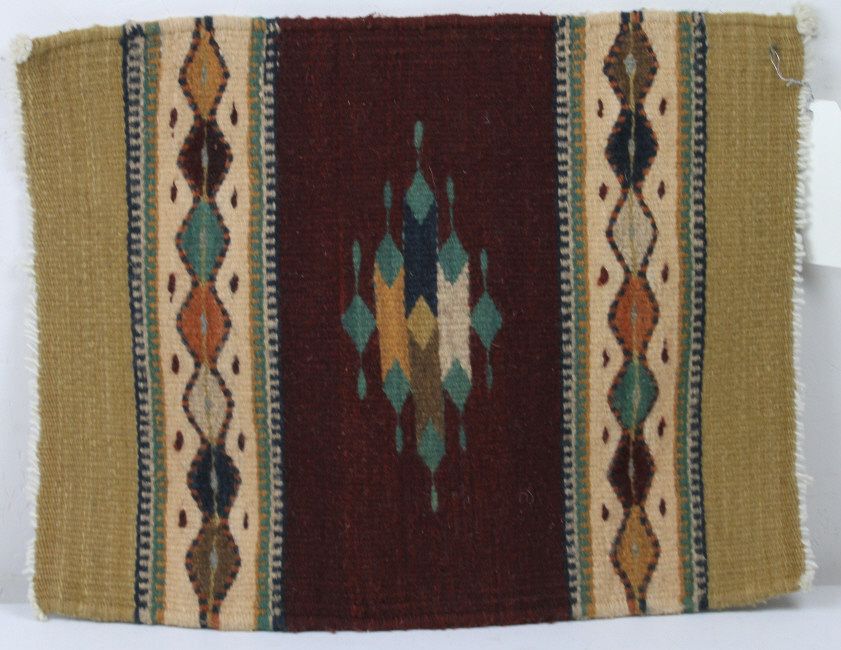 Zapotec Navajo Table Rug This is made by he Zapotec Indians in in Oaxaca, Mexico. The Zapotec are significant because 400 years ago the Spanish missionaries taught the Navajo and Zapotec how to weave, these practices are still mastered today in both Zapatec and Navajo Tribes. This is a Navajo Style Runner with 100% Wool and the Size of 16"x20"