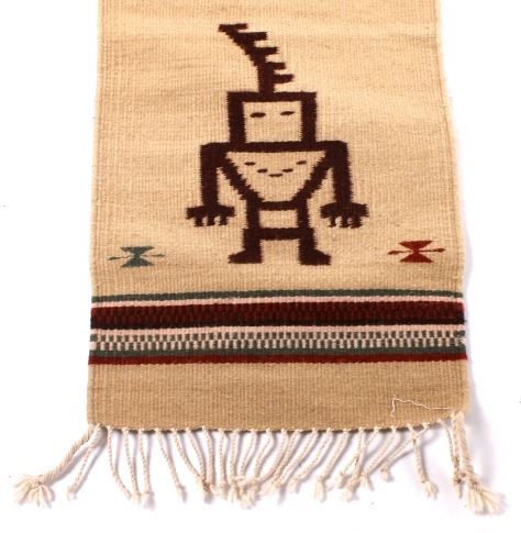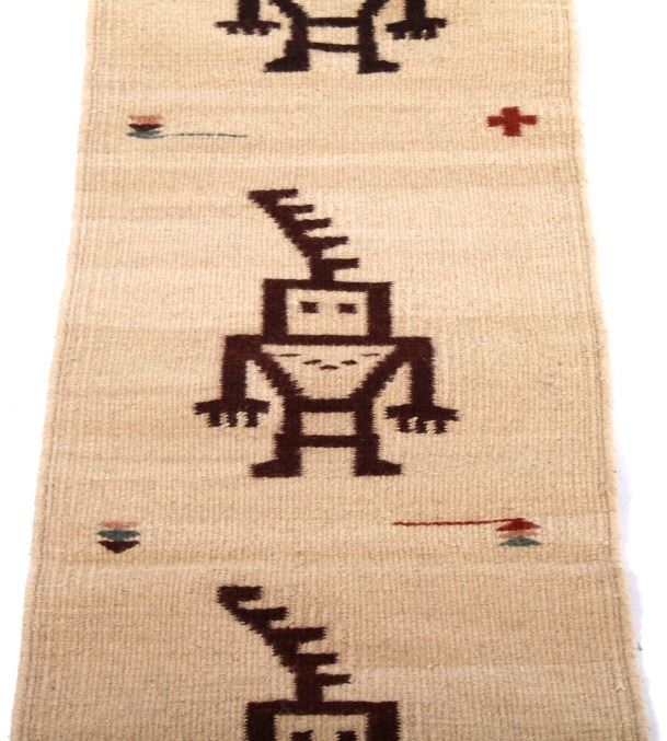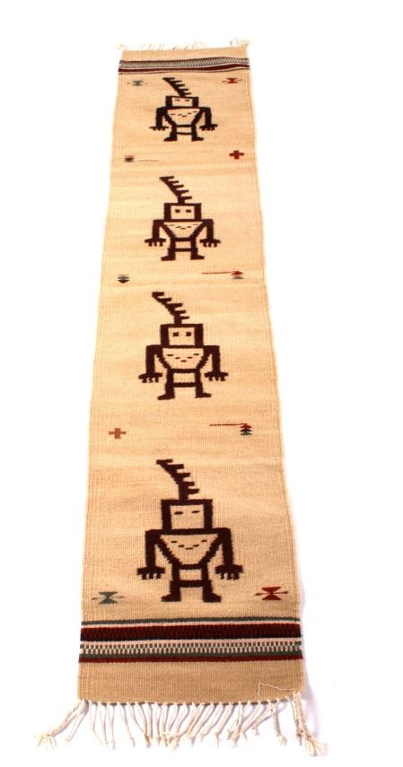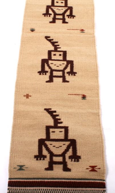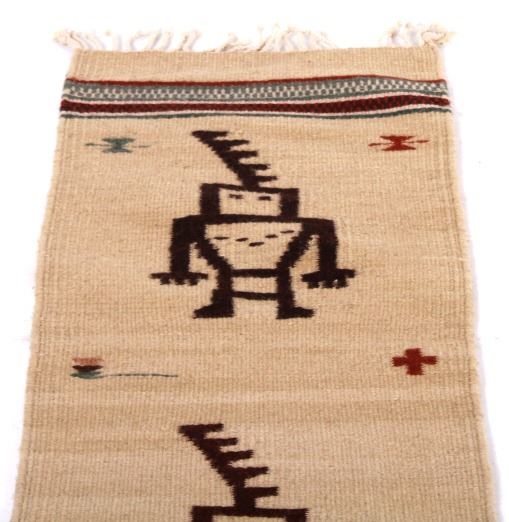 This lot features a Zapotec pictorial pattern rug. The rug has vibrant colors and depicts four human like figures. The Zapotec civilization was an indigenous pre-Columbian civilization that flourished in the Valley of Oaxaca in Mesoamerica. When the Spanish first arrived they taught there style of weaving first to the Zapotec people and later the Navajo. This rug is in good condition for its age. Measures: 76" L x 15 1/2" W