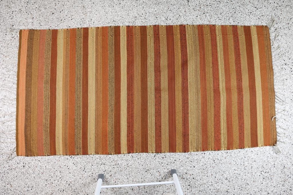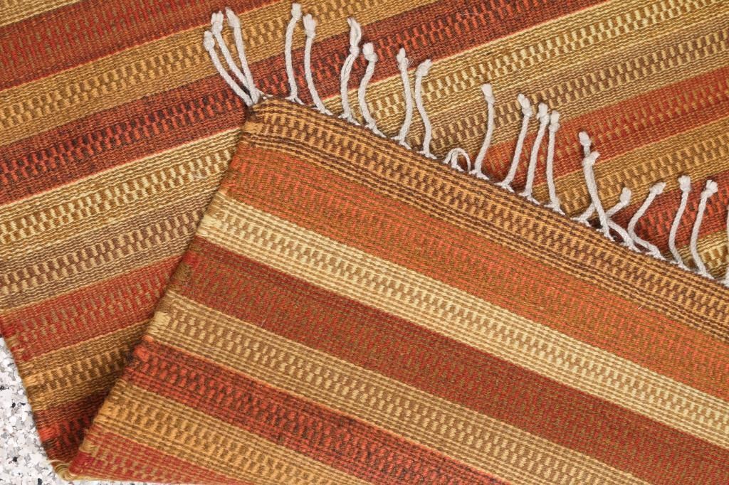 Striped design with fringe. Mustard yellow, orange, brown, cream. Measures 59" x 29". Excellent condition.