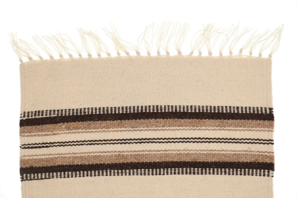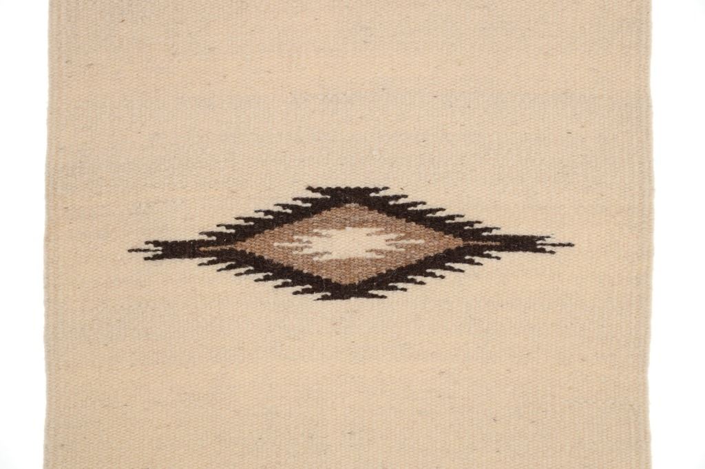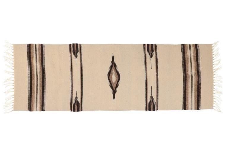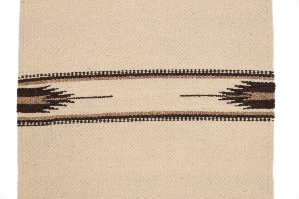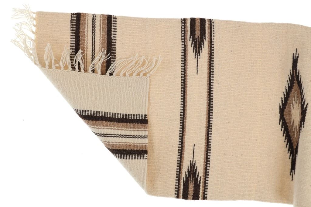 Offered in this lot is this Zapotec Saltillo Banded Wool Runner Rug. The rug features a Saltillo central diamond medallion on a cream field, earth tone bands of light and dark brown colours. The rug features a wonderfully and professionally crafted wool construction that is done in a Saltillo design. A gorgeous piece of artwork, it utilizes neutral, hand spun wool that will complement any space. Zapotec rugs, "tapetes", have been appreciated throughout recorded history. Many cultures flourished in the fertile valley and all have appreciated the Zapotec rugs and weaving of garments for decoration. The use of natural dyes has also made the regions works highly sought after. They use natural elements in the area from nature such as bark, moss, insects and nuts as well as course spun yarn to give each piece its special character. The master weavers of the area today are known around the world for their works of art. The colours are natural dyes of white, brown. Stepped features coloured in light brown and dark brown against a cream background. The condition of this Zapotec Saltillo is in good overall condition.