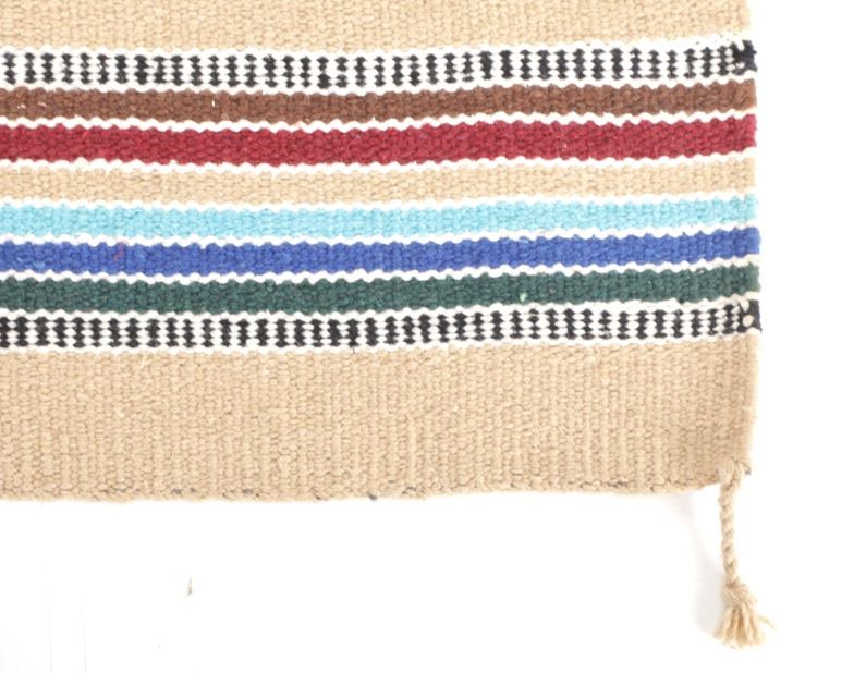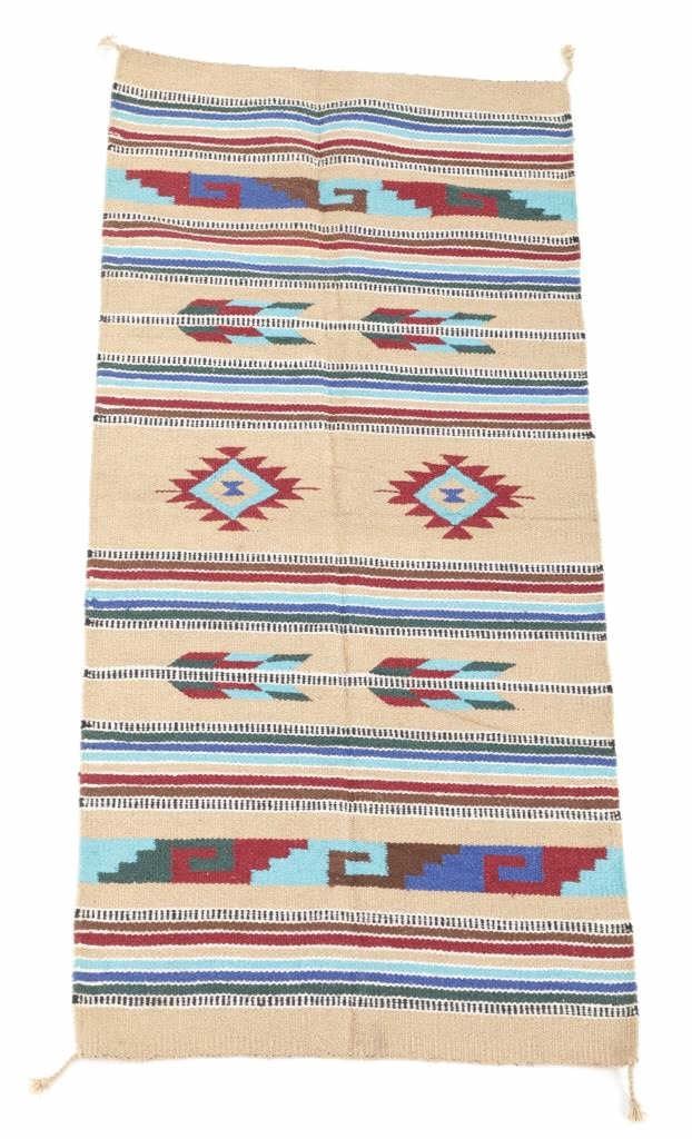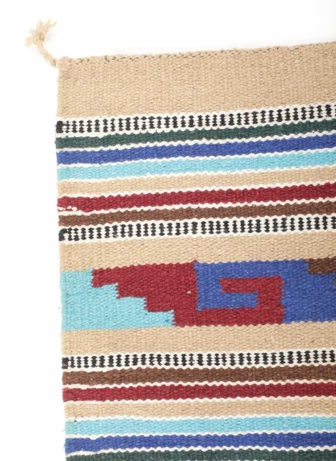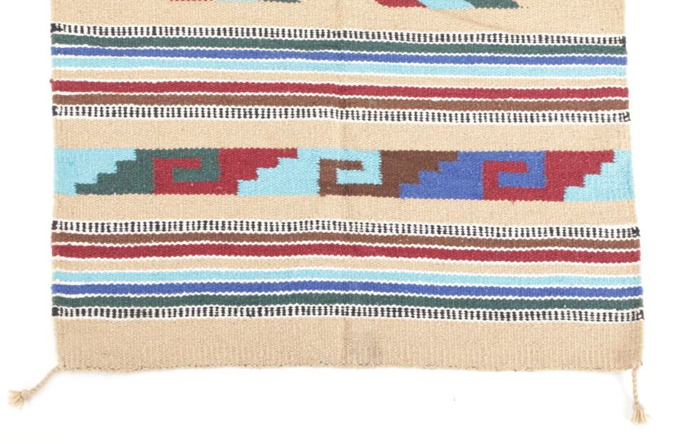 Featured in this lot is a Zapotec Handwoven Saltillo Natural Stepped Medallion Style Rug, circa mid 1900s.  This rectangular wool rug has been designed and hand woven, preserving the art form of the Oaxacan Mexican village in the Zapotec culture. A gorgeous piece of artwork, it utilizes neutral, hand spun wool that will complement any space. Zapotec rugs, "tapetes", have been appreciated throughout recorded history. Many cultures flourished in the fertile valley and all have appreciated the Zapotec rugs and weaving of garments for decoration. The use of natural dyes has also made the region's works highly sought after. They use natural elements in the area from nature such as bark, moss, insects and nuts as well as course spun yarn to give each piece its special character. The master weavers of the area today are known around the world for their works of art. The colours are natural dyes of white, turquoise, red, navy blue, green, and black. Center stepped medallions coloured in red, turquoise and navy blue, large Zapotec "flechas" in green, red, and turquoise. Stepped design end panels with alternating coloured vertical bands throughout. Rug is in very nice condition. Natural dyes are stunning with no bleeding of colours. Tight knot weave, end fringe tight. Measures 64"L x 31"W.*