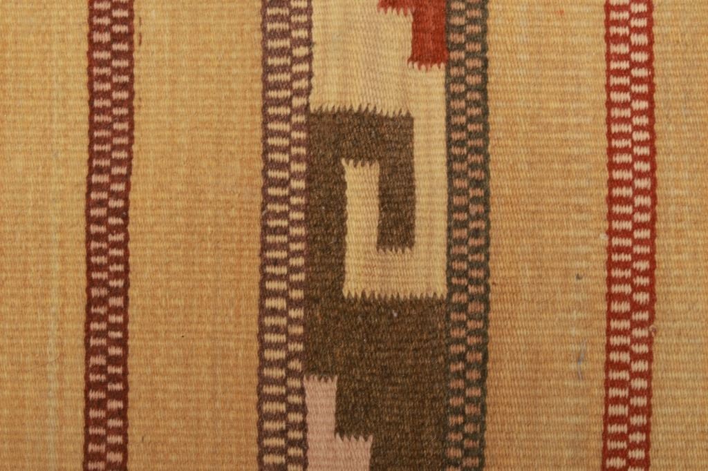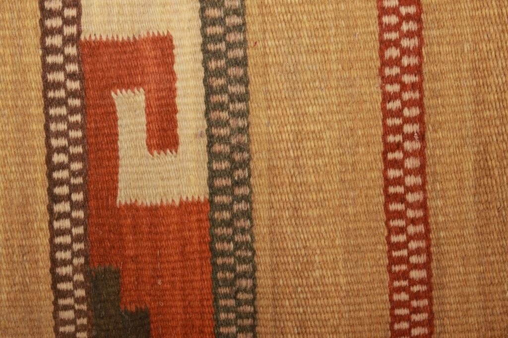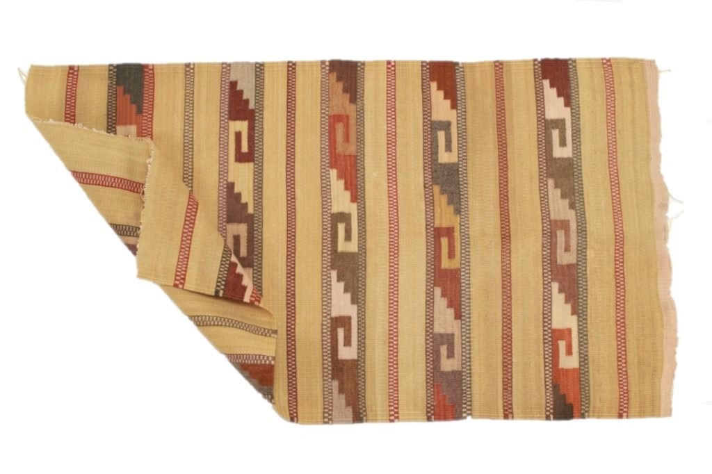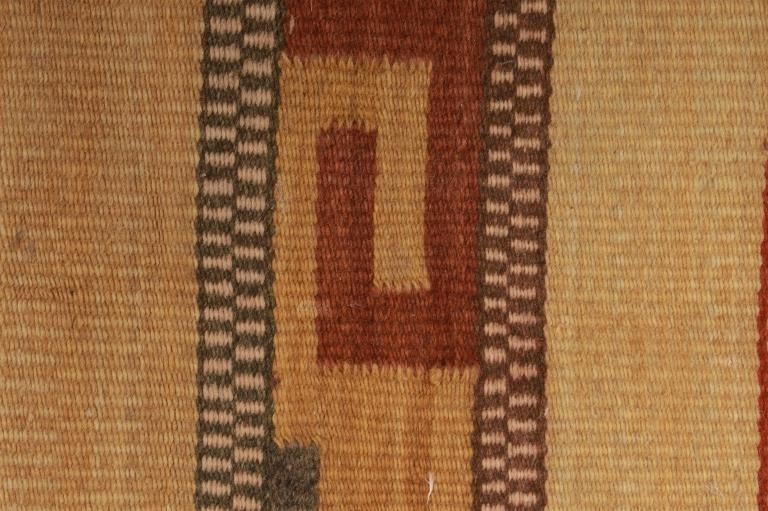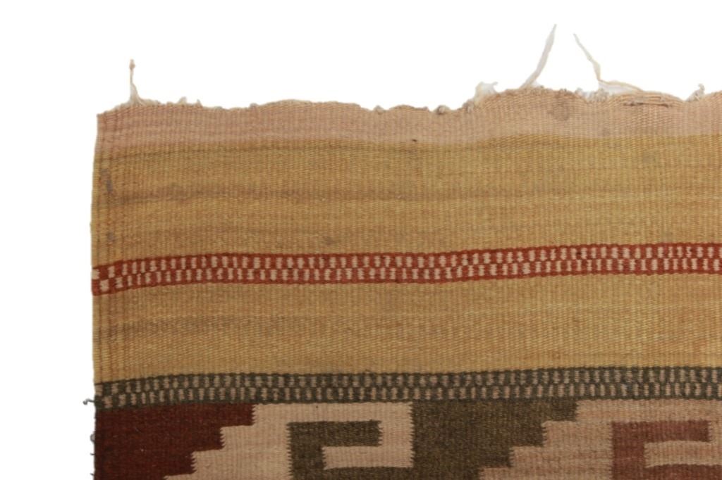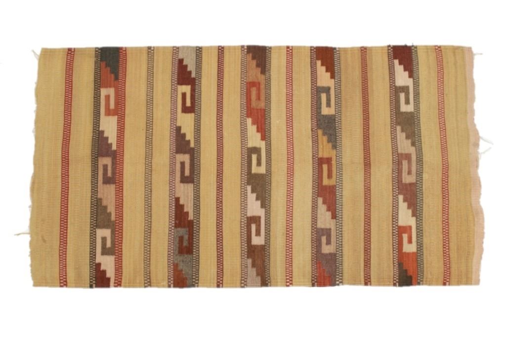 Featured in this lot is this tightly woven, Zapotec, stepped mesa design Saltillo rug, circa 1940's. This really fine, tightly woven rug shows a field of mustard yellow with bands of stepped geometric patterns and mesa bands throughout. Zapotec rugs are wool-woven in a foot loom in Teotitlan del Valle, Oaxaca. The town has a pre-Hispanic weaving tradition and is world famous for its fine tapestries and wall hangings decorated with traditional Zapotec and Mixtec fretwork, idols, animals, or reproductions of famous creations by artists like Diego Rivera, Pablo Picasso, and M.C. Esher. The condition of this rug is fair, with the fringe showing wear consistent with the age of the rug. The measurements of this rug are 56" x 29".