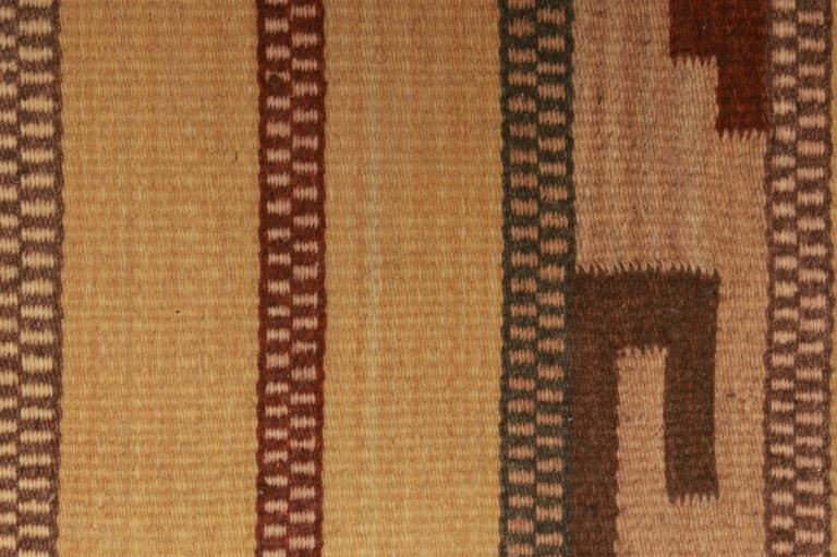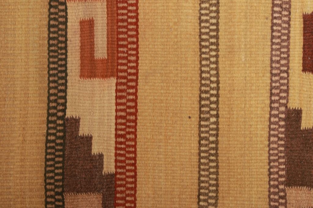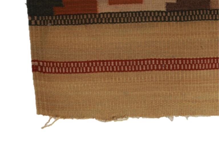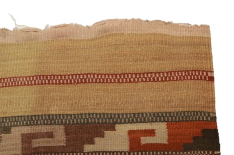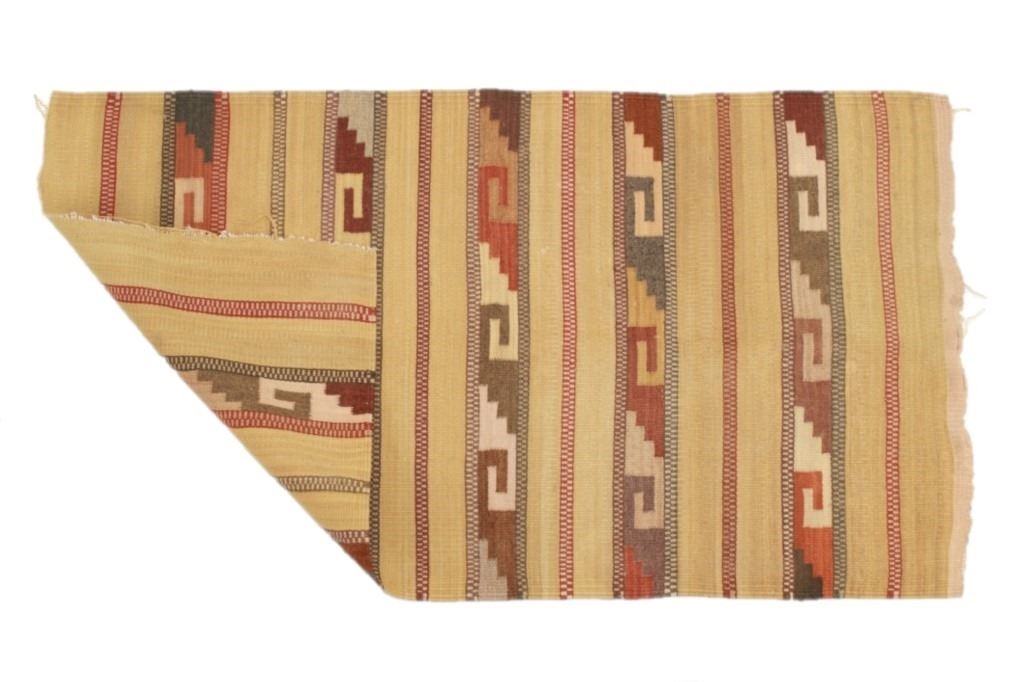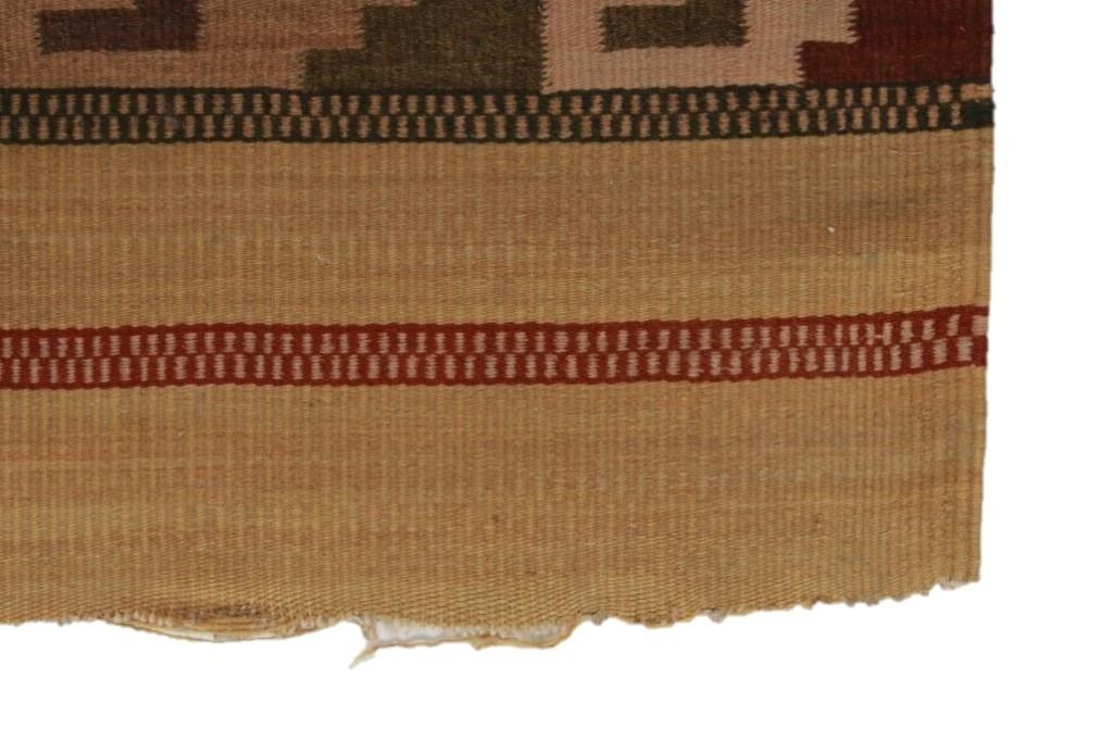 Featured in this lot is this tightly woven, Zapotec, stepped mesa design Saltillo rug, circa 1940's. This really fine, tightly woven rug shows a field of mustard yellow with bands of stepped geometric patterns and mesa bands throughout. Zapotec rugs are wool-woven in a foot loom in Teotitlan del Valle, Oaxaca. The town has a pre-Hispanic weaving tradition and is world famous for its fine tapestries and wall hangings decorated with traditional Zapotec and Mixtec fretwork, idols, animals, or reproductions of famous creations by artists like Diego Rivera, Pablo Picasso, and M.C. Esher. The condition of this rug is fair, with the fringe showing wear consistent with the age of the rug. The measurements of this rug are 56" x 29".