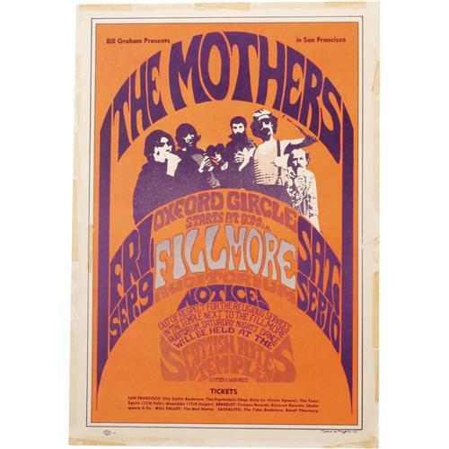 <B>Mothers of Invention Fillmore/Winterland Concert Poster Group (Bill Graham, 1966-67).</B></I> It's time to freak out with Frank Zappa and the Mothers of Invention! First up is poster BG-27, a first printing poster in Good condition with tape residue/stains along the outside borders, measuring approximately 14" x 20". Next is a VG+ second-printing copy of BG-97, for a set of shows co-starring the late Tim Buckley and the Chambers Brothers. It measures approximately 12.75" x 21.75".<BR><BR><b>Shipping:</b> Flat Material, Small (<a target="_blank" href="http://www.heritageauctions.com/common/shipping.php">view shipping information</a>)