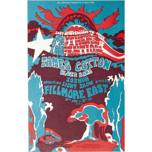 <B>Mothers of Invention Fillmore East Concert Poster (Bill Graham, 1968)</B></I> "Last N. Y. Appearance 'Til Peace" was the "threat" made by Frank Zappa's Mothers of Invention, on the poster for this Spring, 1968 Fillmore East show (numbered 4 in the series). How else could Richard Nixon react, except to pull all the troops from Vietnam? Also appearing was the James Cotton Blues Band, who helped introduce the blues to a whole generation of young, white concert attendees, back in the '60s. The poster was only printed once; it measures approximately 14" x 22", and is in NM condition.<BR><BR><b>Shipping:</b> Flat Material, Large (<a target="_blank" href="http://www.heritageauctions.com/common/shipping.php">view shipping information</a>)