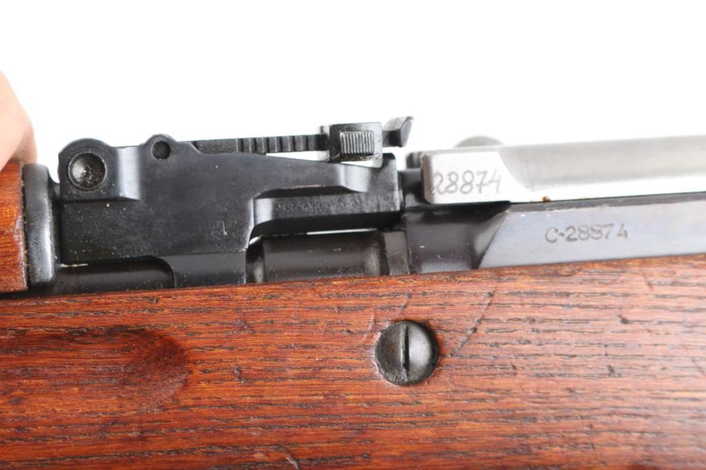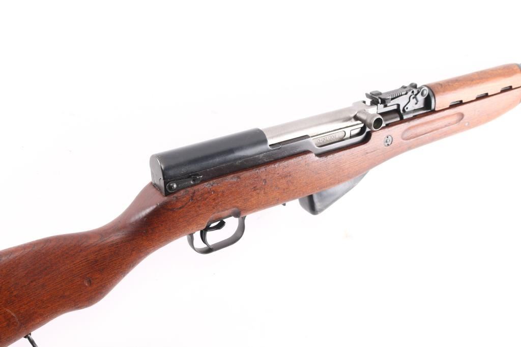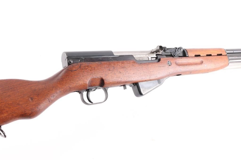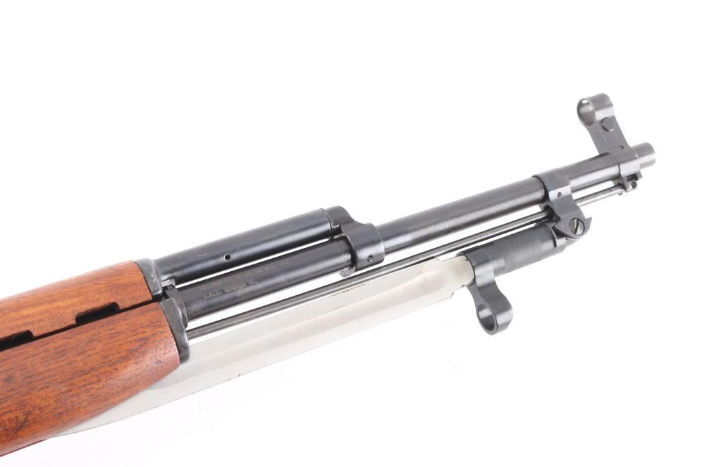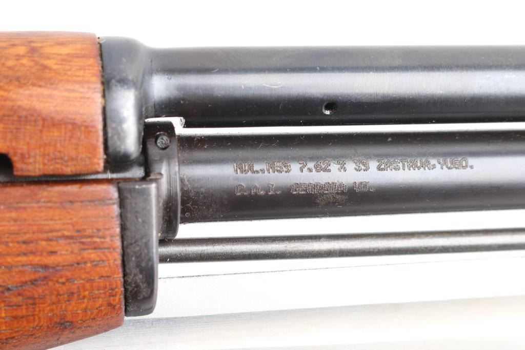 Zastava M59 PAP, also known as Papovka, is a Yugoslav licensed version of Soviet SKS semi-automatic rifle.'Mdl 59' Yugoslavian made gas-operated semi automatic rifle chambered in 7.62x39mm. Imported by CAI, right barrel. Features a blued finish, 20.5" barrel, hooded post front sight, tangent rear sight graduated to1,000 meters, cleaning rod, folding blade bayonet, manual safety, smooth trigger, fixed 10 round magazine, smooth wood handguard, pistol grip shoulder stock and trapdoor metal buttplate. Serial number matches on the receiver, bolt carrier, triggerguard, and stock. Rifle retains approximately 98% of it's blued finish, with slight edge wear, bore appears very good/bright, and wood stocks are very good. Serial numbers puts it at pre 1967,