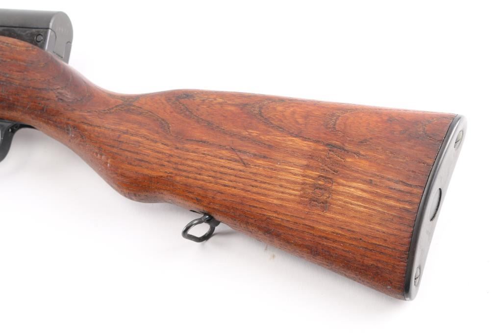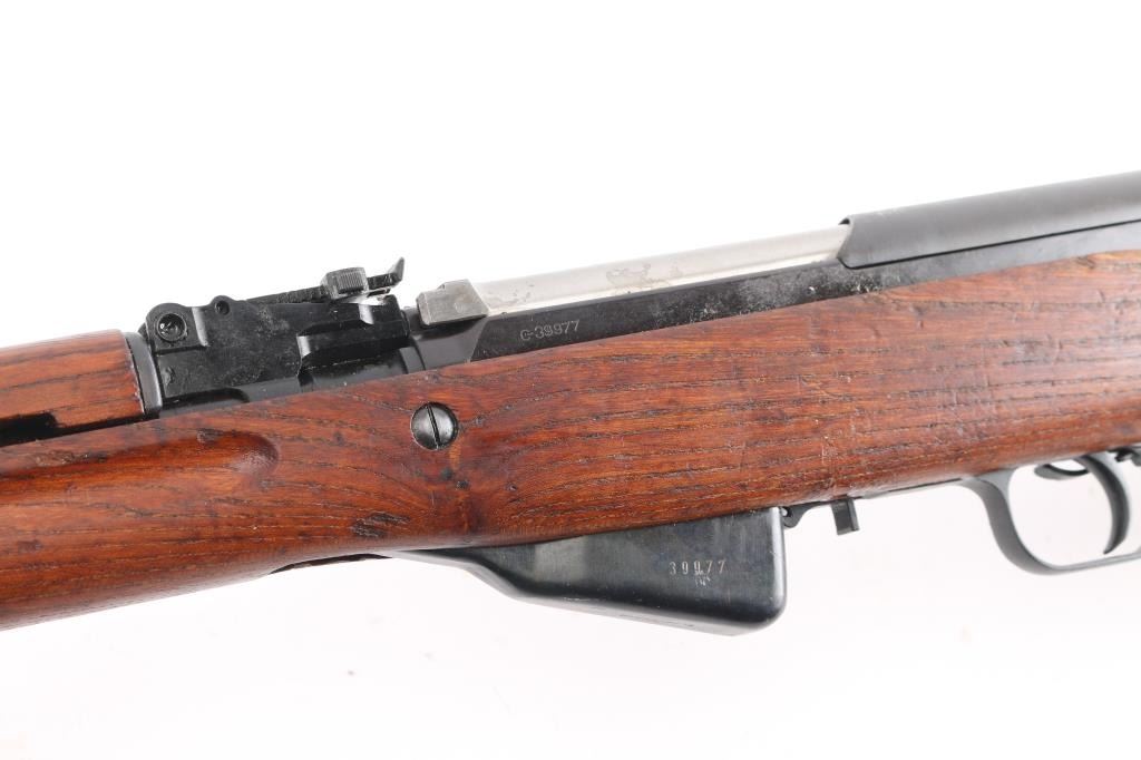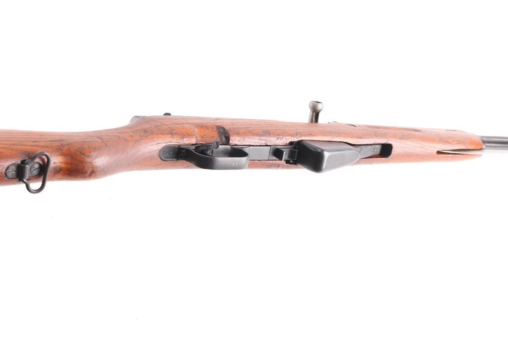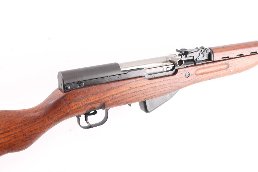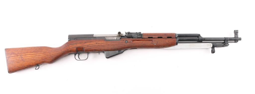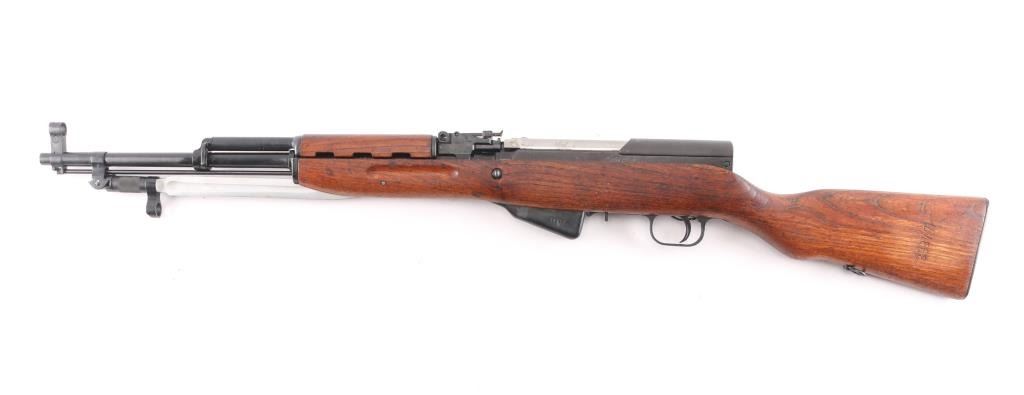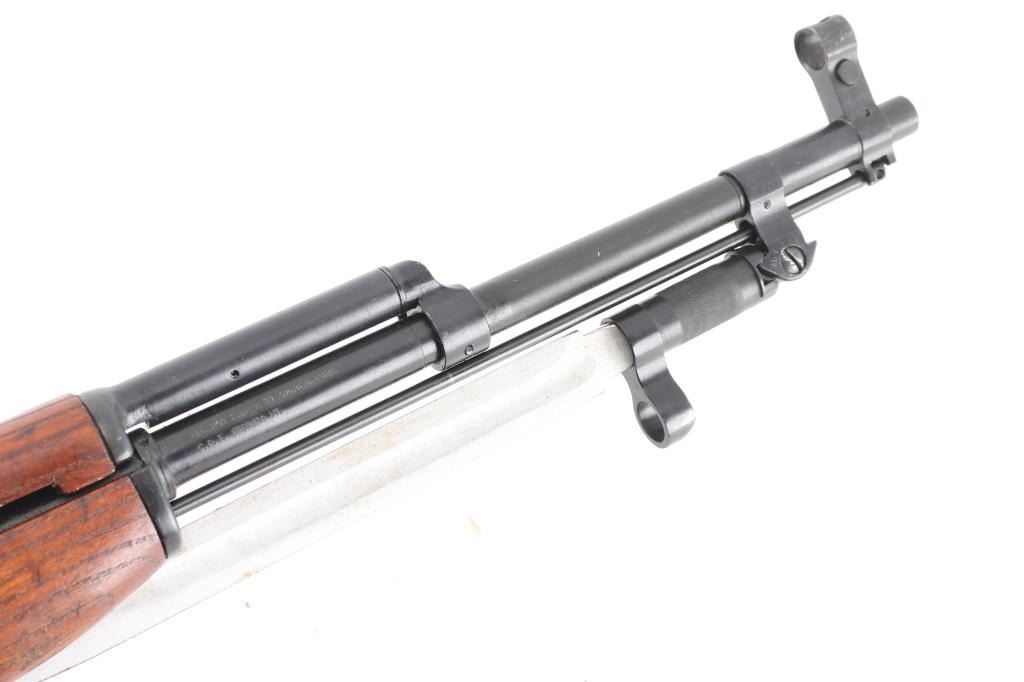 Zastava M59 PAP, also known as Papovka, is a Yugoslav licensed version of Soviet SKS semi-automatic rifle.'Mdl 59' Yugoslavian made gas-operated semi automatic rifle chambered in 7.62x39mm. Imported by CAI, right barrel. Features a blued finish, 20.5" barrel, hooded post front sight, tangent rear sight graduated to1,000 meters, cleaning rod, folding blade bayonet, manual safety, smooth trigger, fixed 10 round magazine, smooth wood handguard, pistol grip shoulder stock and trapdoor metal buttplate. Matching serial numbers on the receiver, bolt carrier, magazine,triggerguard, and stock. Rifle retains approximately 90% of it's blued finish, with some minor edge wear/scratches, bore appears excellent/bright, and wood stocks are good with minor scratches/dings. Serial numbers puts it at pre 1967,